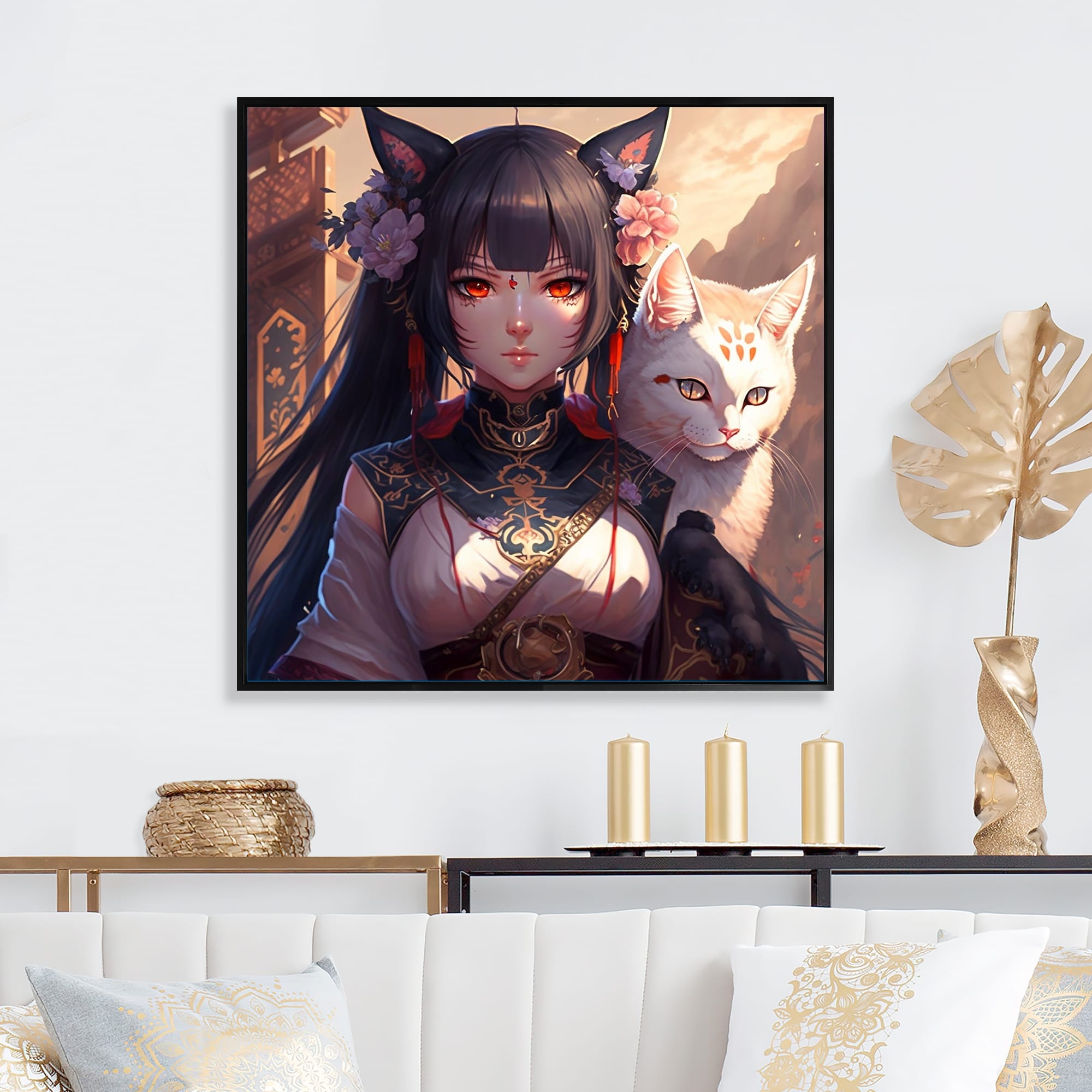 Designart "Anime Woman With White Cat" Asian Woman Framed Canvas Wall Art Print