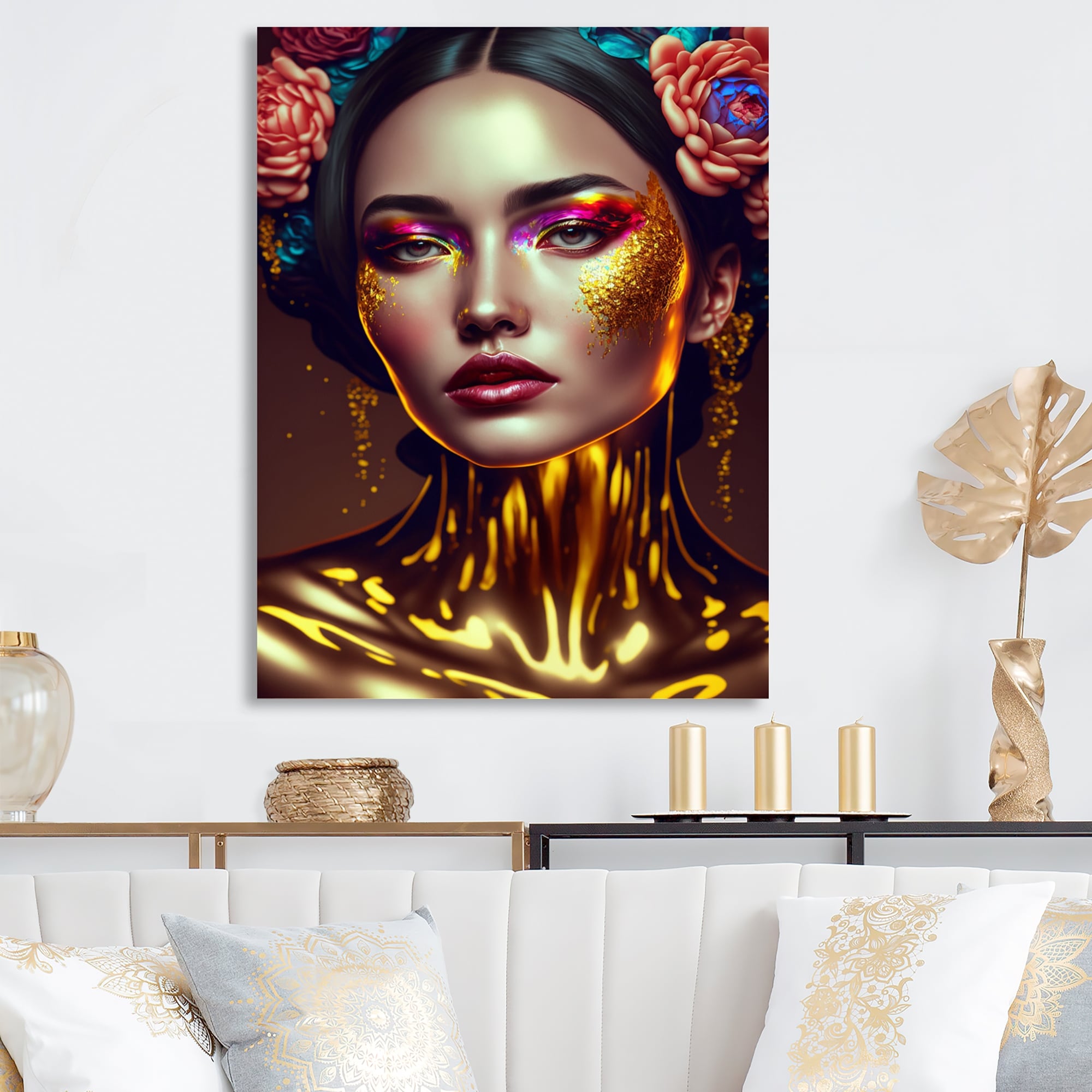 Designart 'Gold And Black Floral Asian Woman I' Contemporary Glam Canvas Wall Art