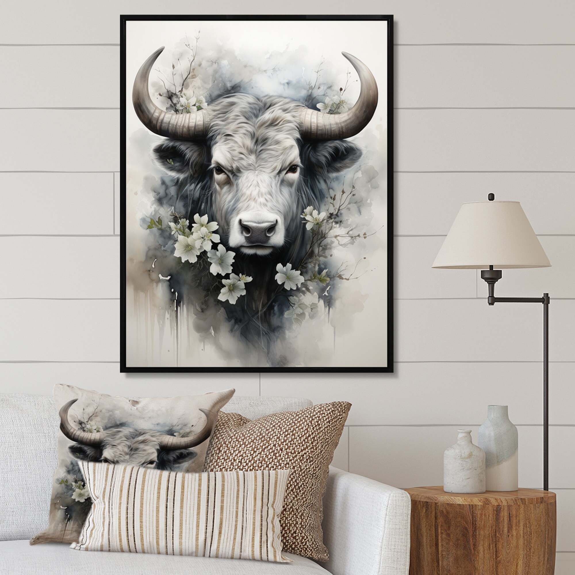 Designart "Asian Art Cow Sumi XIII" Asian Art Framed Canvas Wall Art