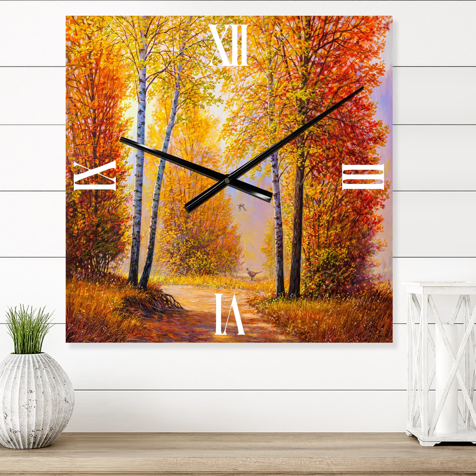 Designart 'Morning Sunlight Through the Autumn Trees' Lake House Wall Clock Decor