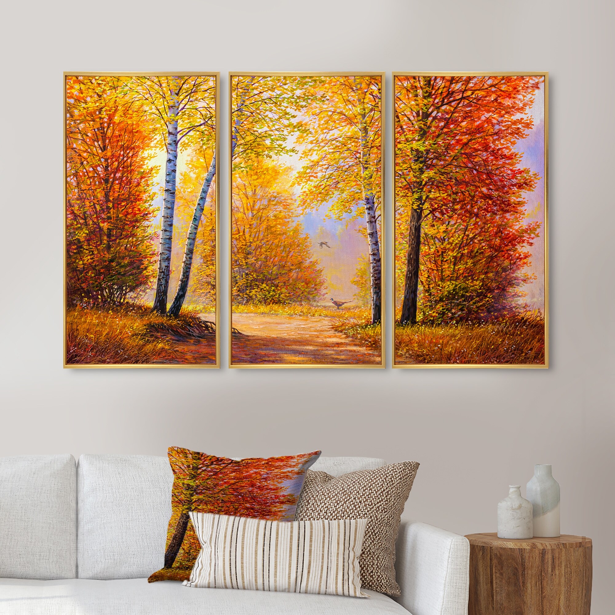 Designart "Morning Sunlight Through the Autumn Trees" Lake House Framed Wall Decor Set of 3 - 4 Colors of Frames
