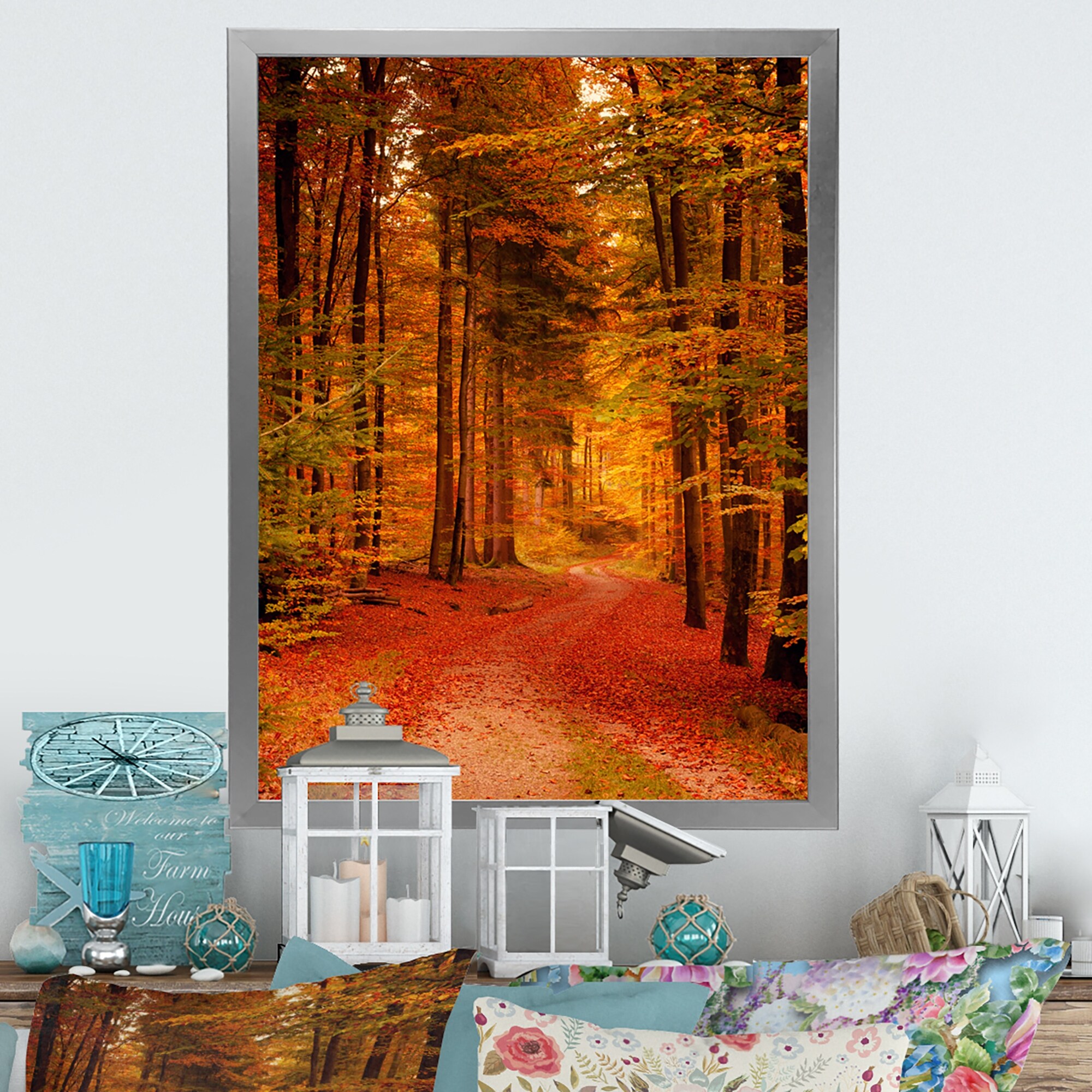 Designart 'Path In the Autumn Forest Orange Leaves Landscape' Lake House Print on Natural Pine Wood