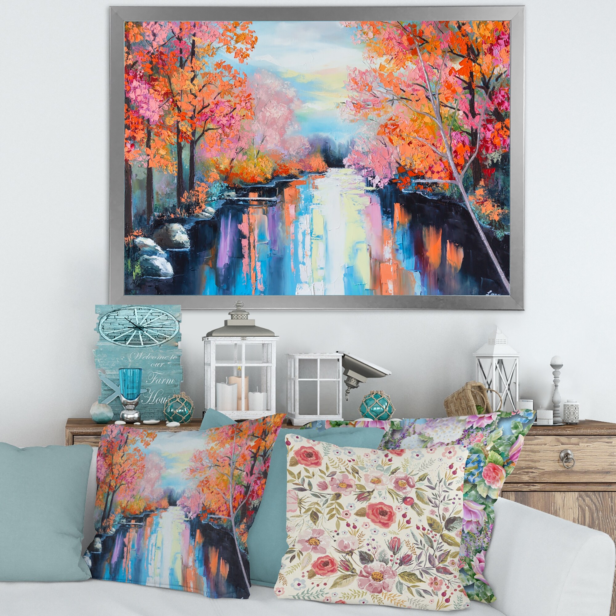 Designart "Orange Autumn Forest By the River" Lake House Framed Art Print