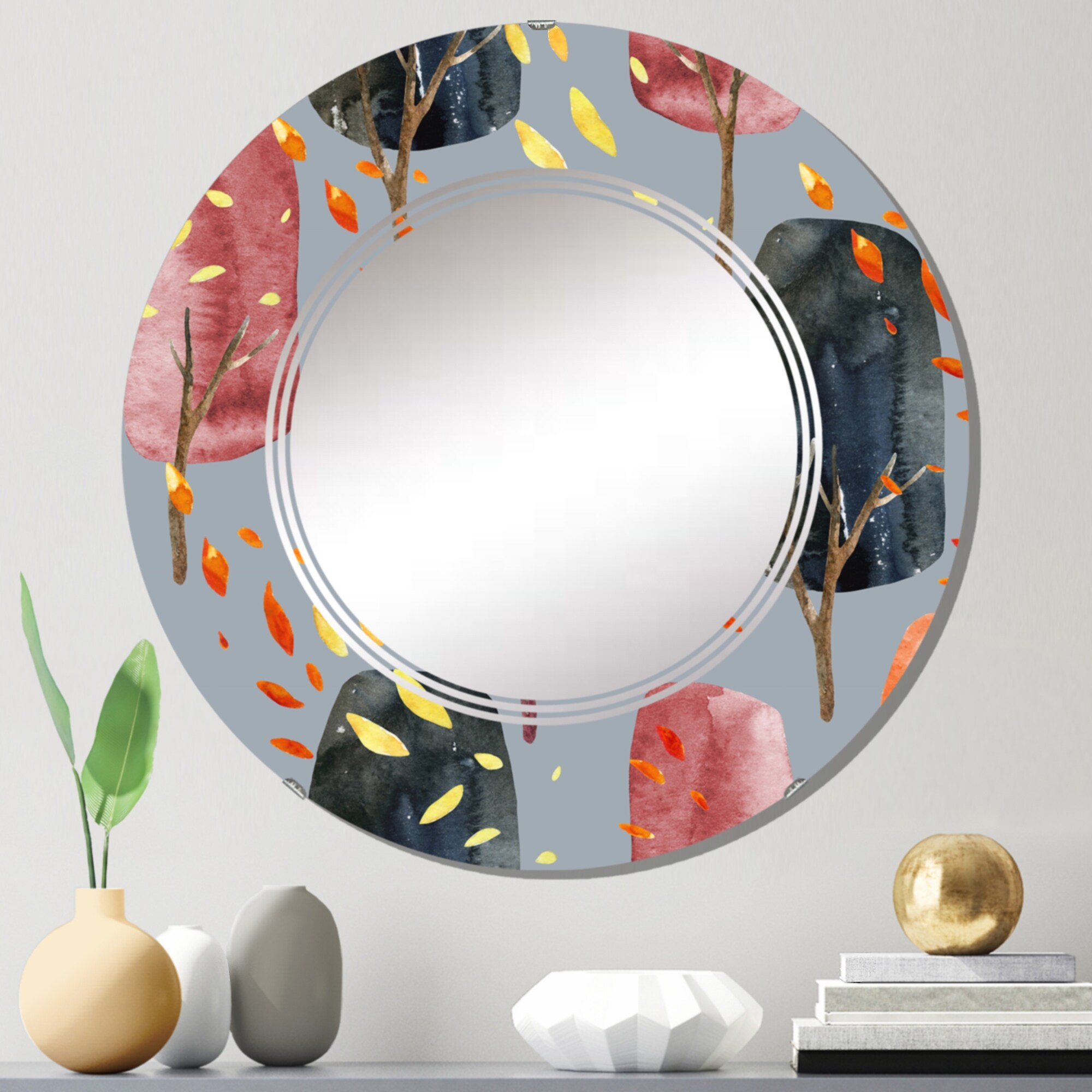 Designart 'Retro Autumn Trees With Falling Leaves II' Printed Patterned Wall Mirror