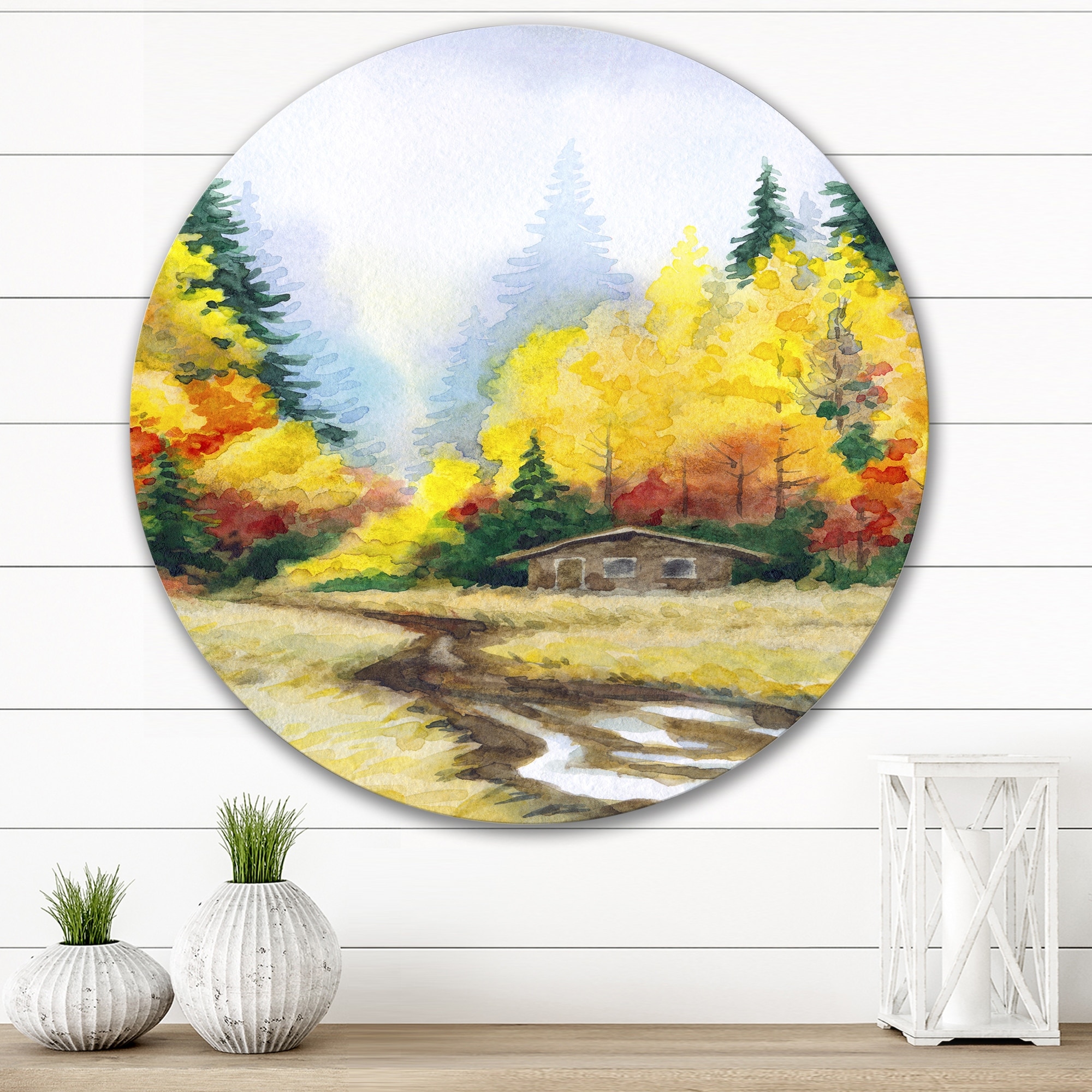 Designart 'Yellow Autumn Trees' Traditional Metal Circle Wall Art