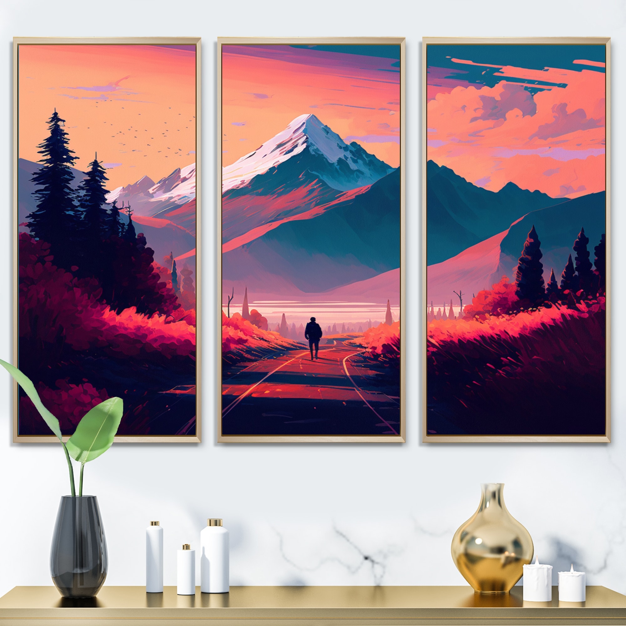 Designart "Magenta Autumn Morning Road IV" Landscape Mountains Framed Canvas Wall Art Print - 3 Panels