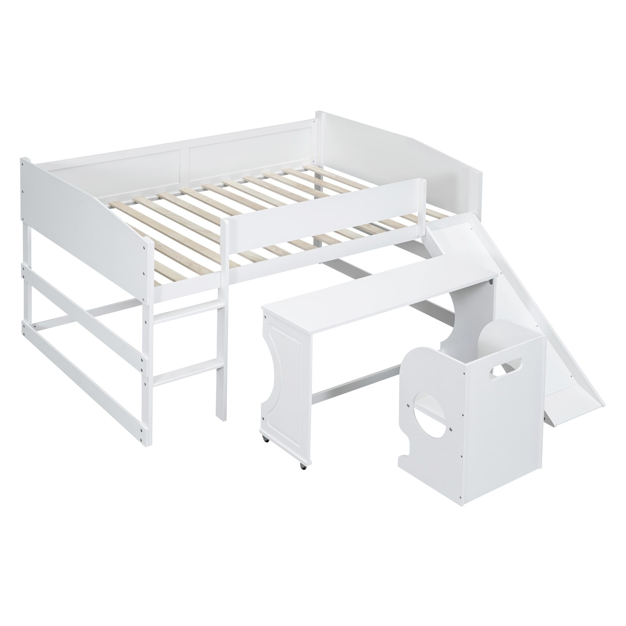 Full Wood Loft Bed with Desk, Drawers & Lateral Portable Desk, White