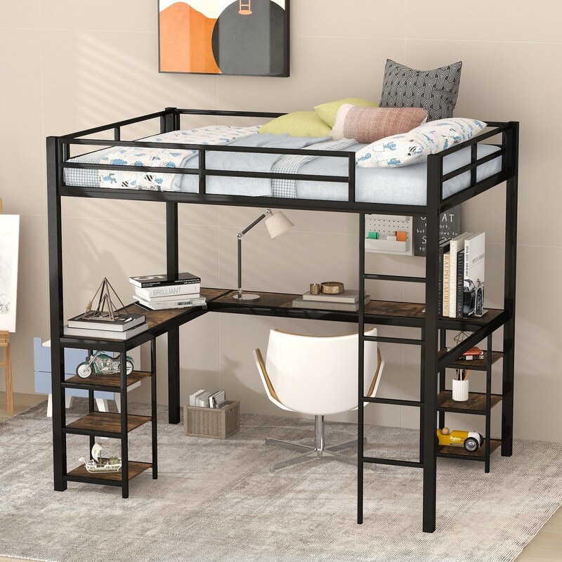Metal Loft Bed with Desk, Shelves & Guardrails