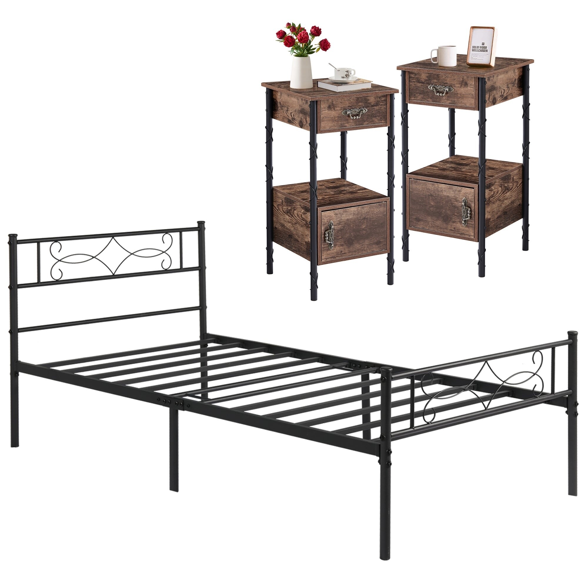 Industrial 3-Piece Bedroom Set with Black Platform Bed Frame and Vintage Nightstand Set of 2