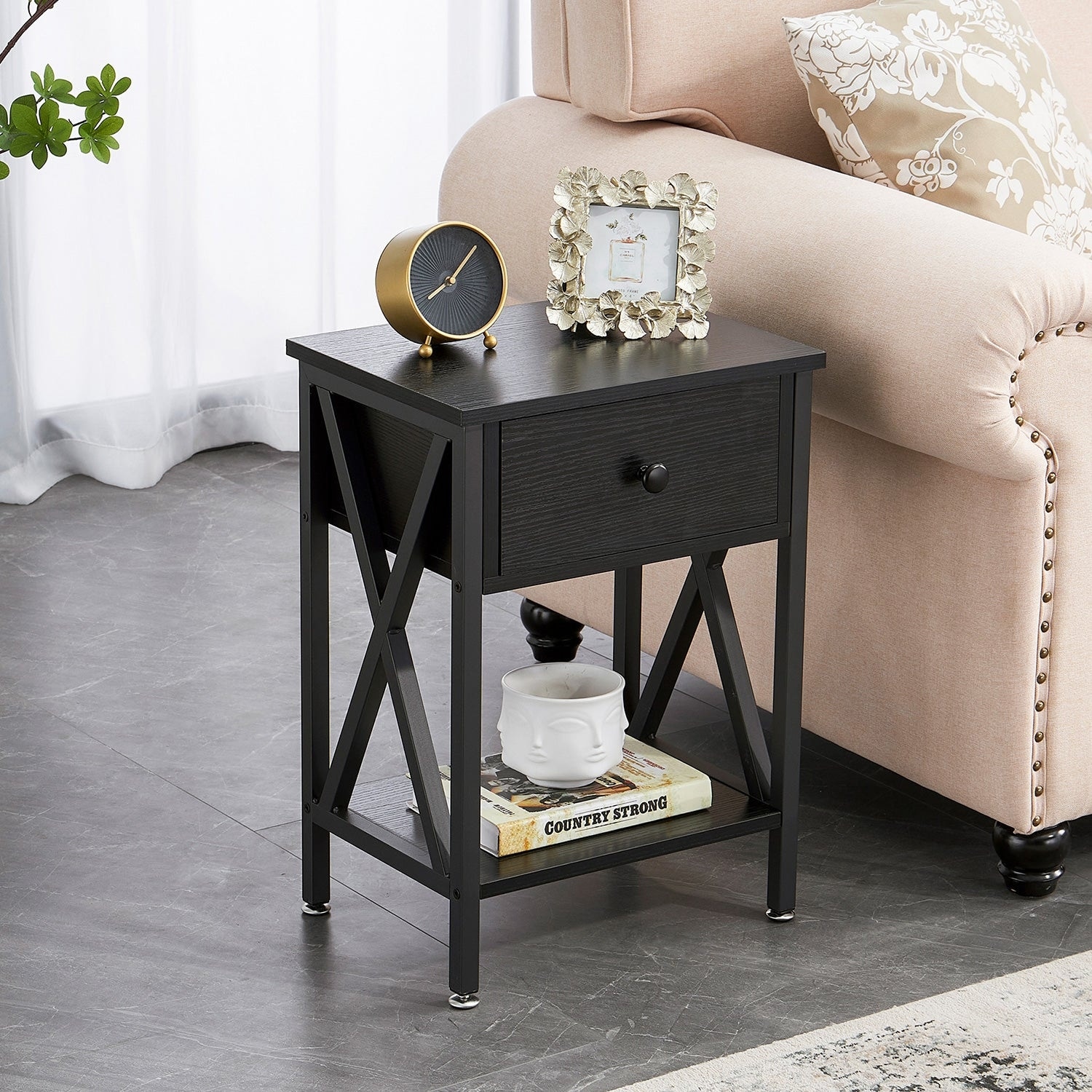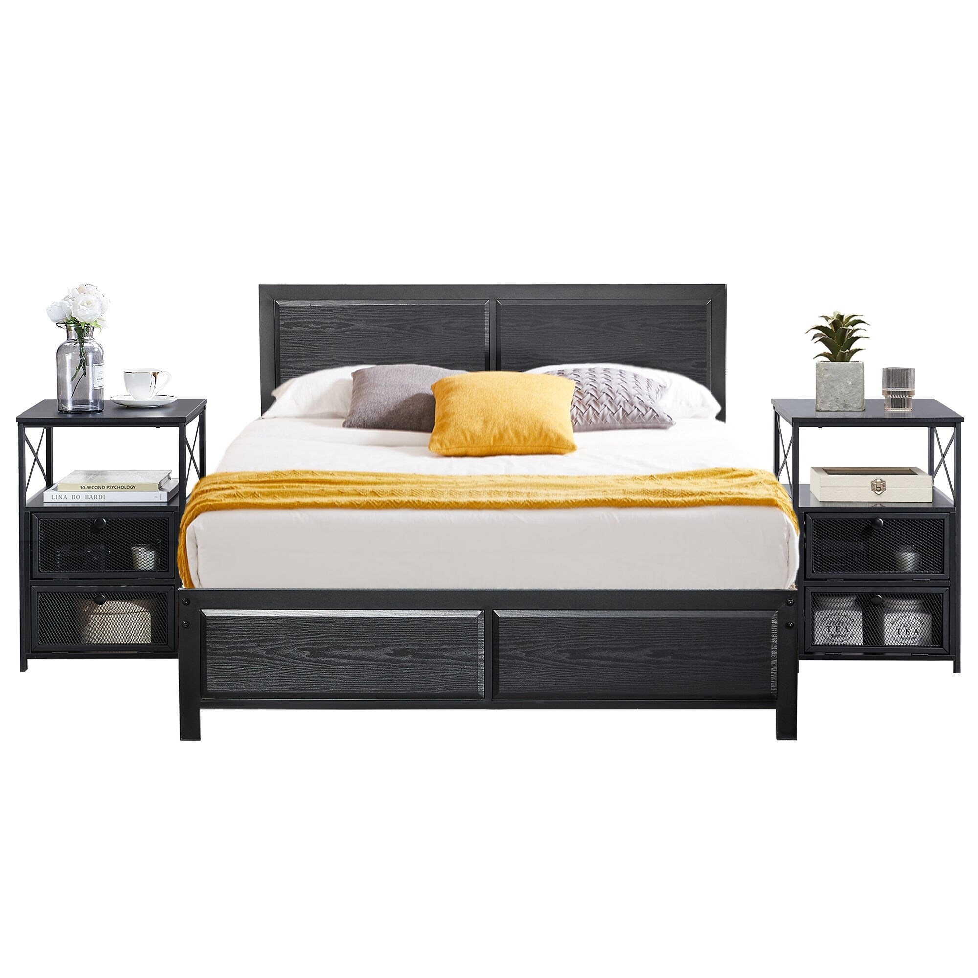 Industrial 3-piece Bedroom Set Black Platform Bed Frame and Modern Nightstands Set of 2