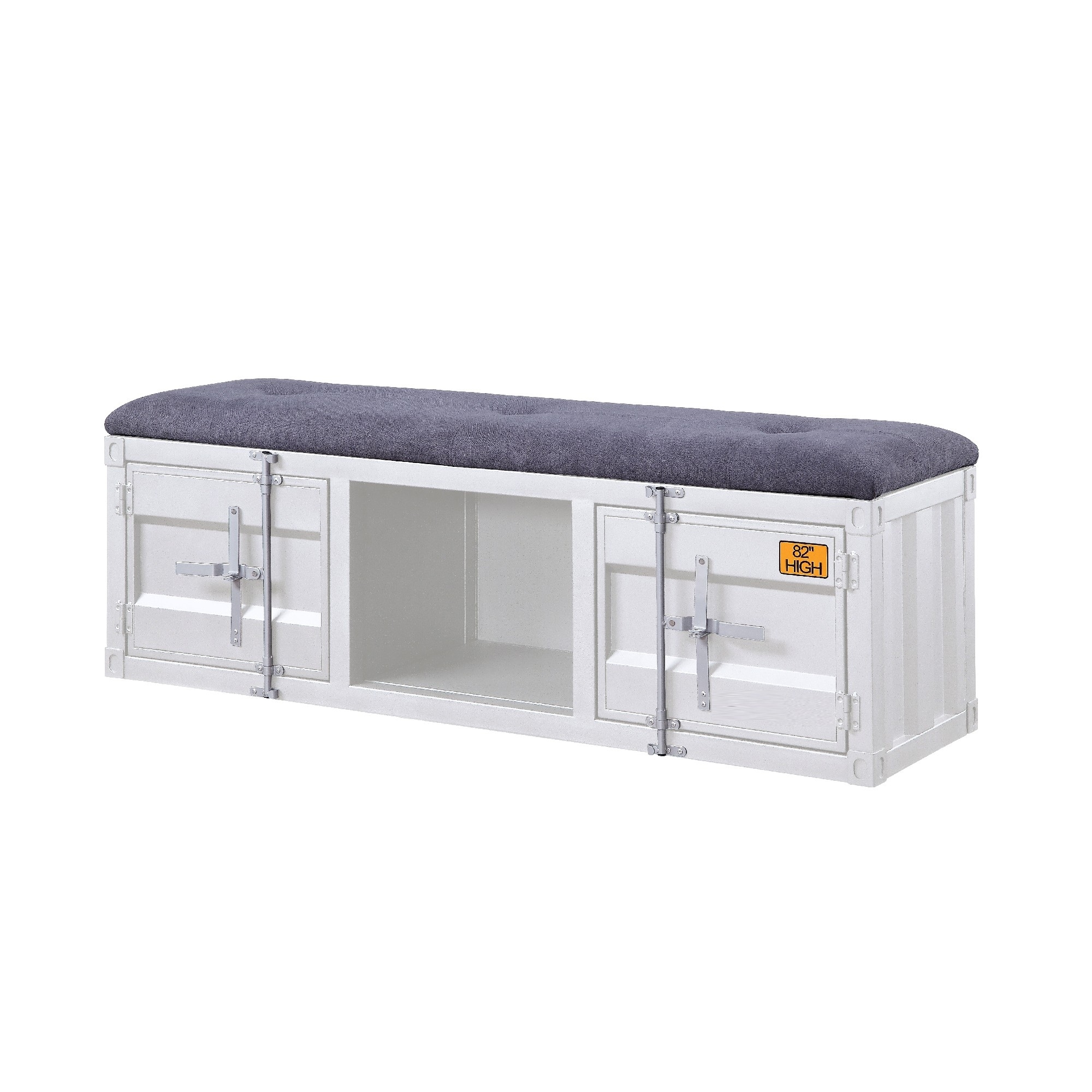 Metal Bench with Open Storage and Tufted Fabric Seat, White and Gray