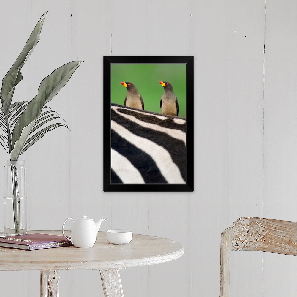 "Yellow Billed oxpeckers (Buphagus africanus) on top of a zebra, Ngorongoro Cr" Black Framed Print