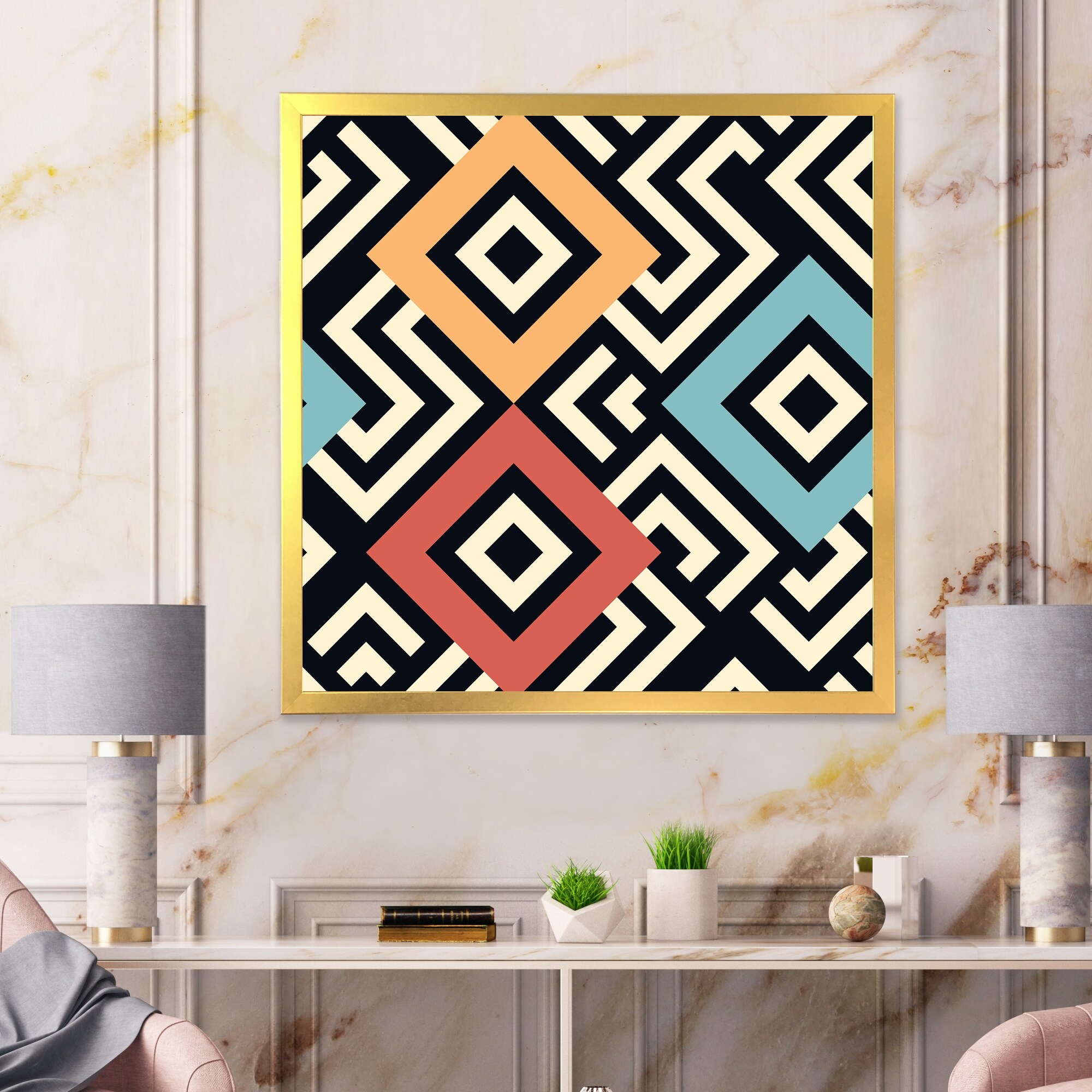 Designart "Geometric Meandering Squares, Blue Red, Orange I" Patterned Framed Art Print