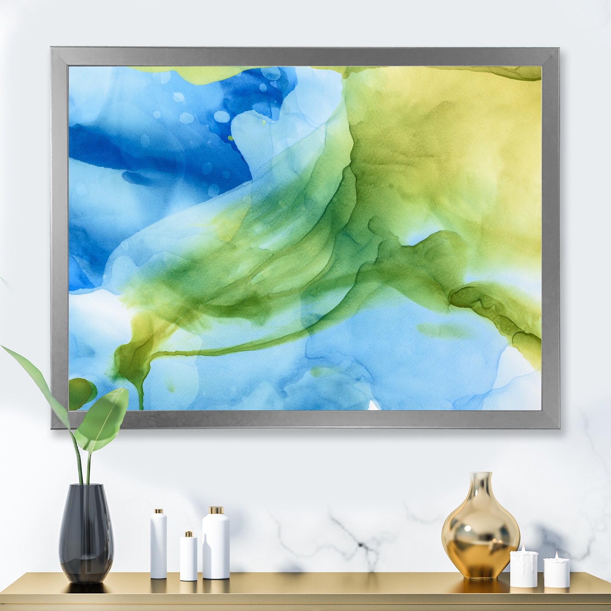 Designart "Green Blue Splashes Inks" Abstract Framed Art Print