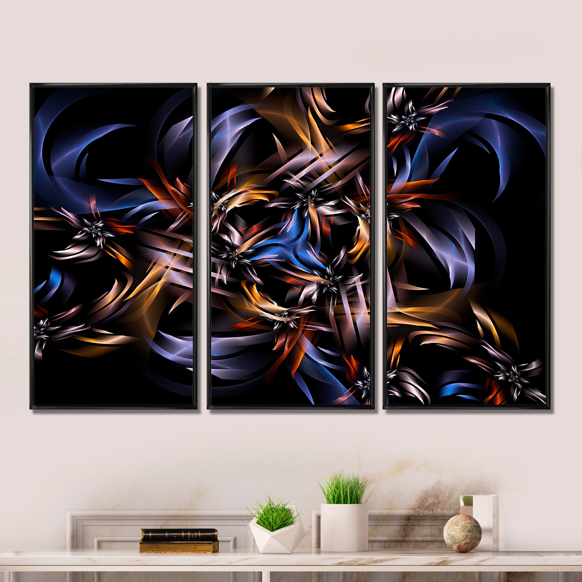 Designart "Blue Fractal Light Art in Dark" Abstract Framed Art Prints Set of 3 - 4 Colors of Frames