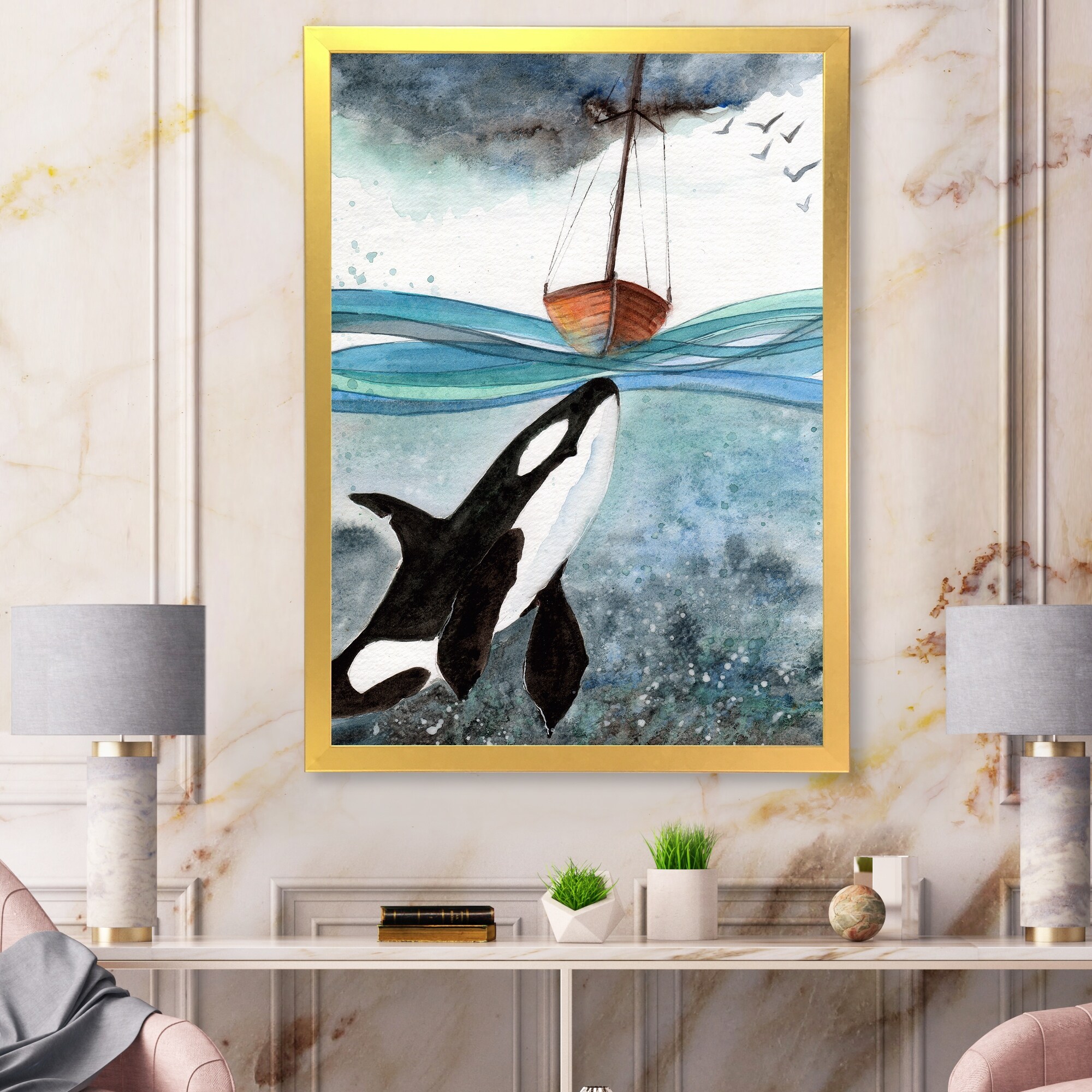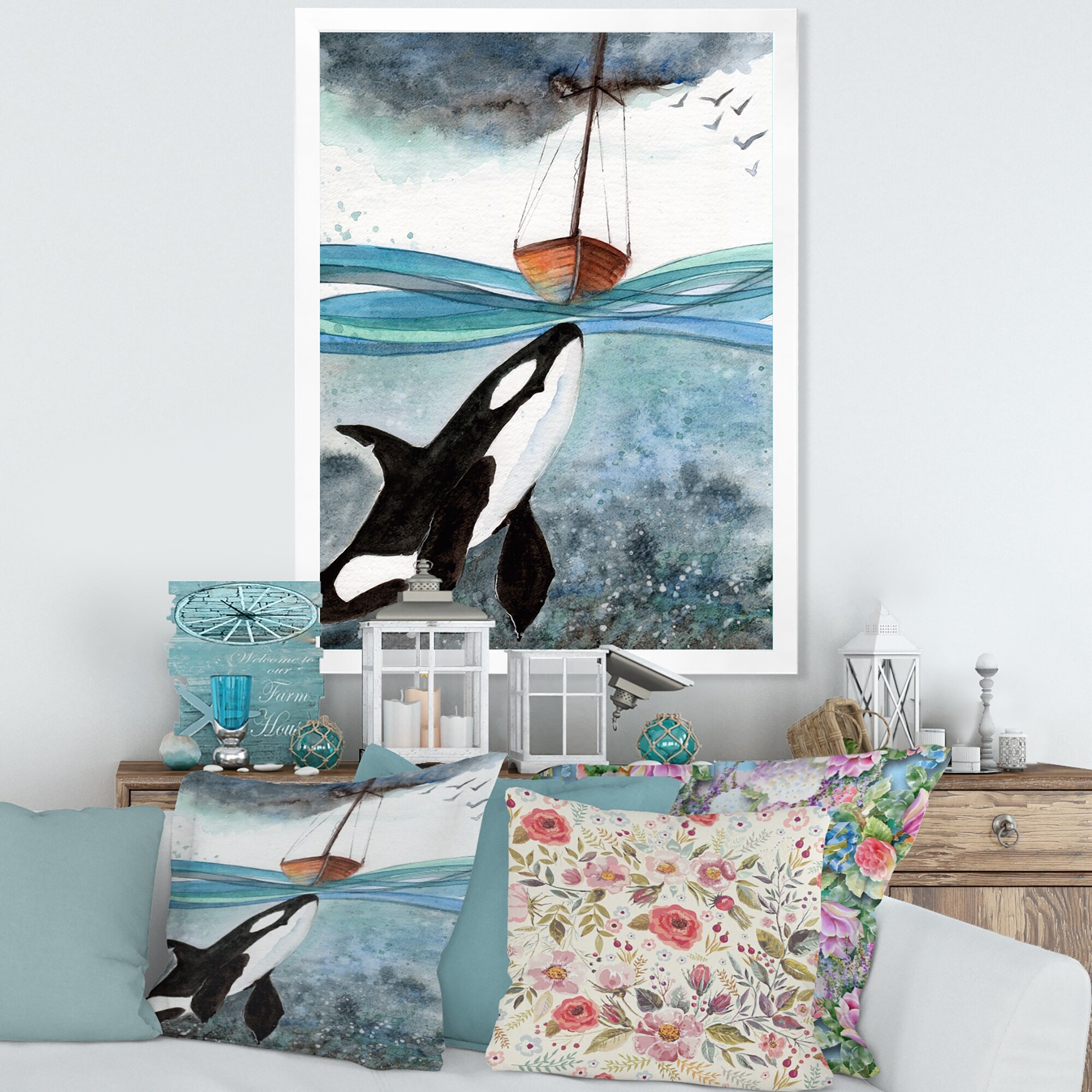 Designart "Orca In the Blue Sea" Nautical & Coastal Framed Canvas Wall Art Print