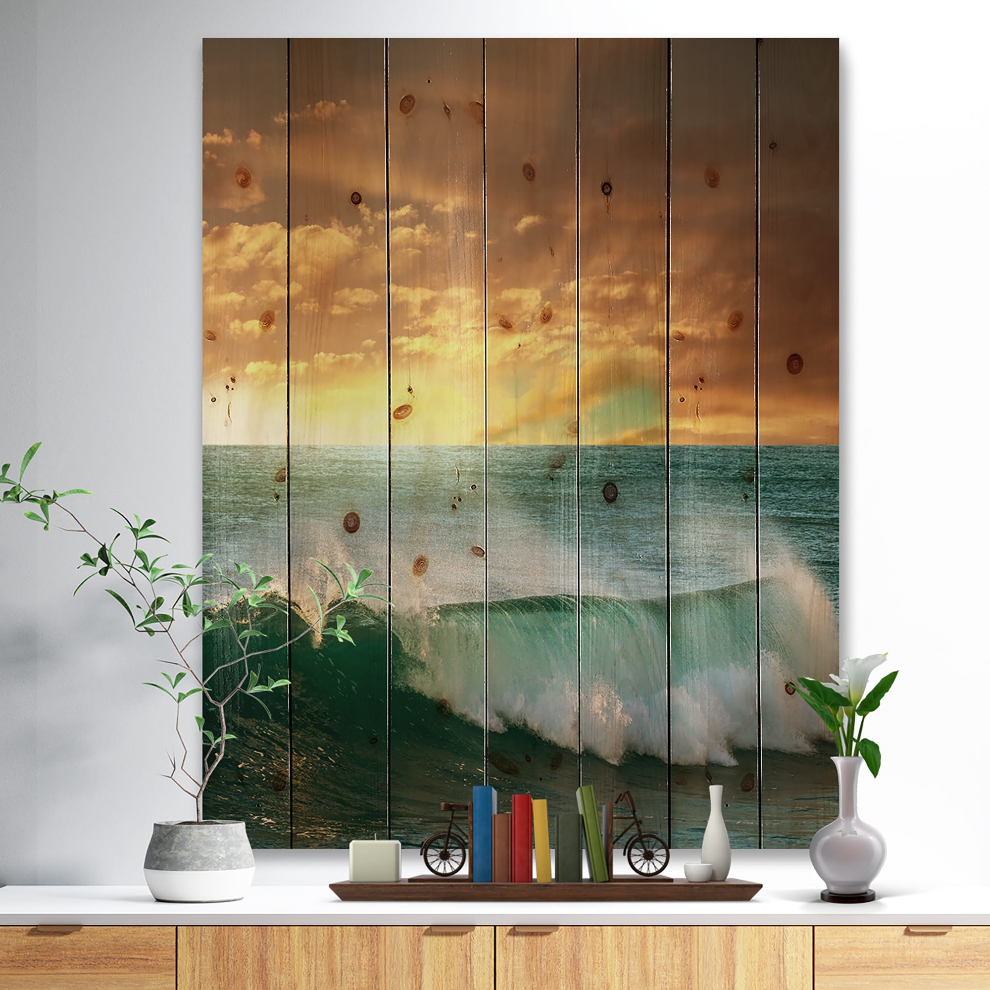 Designart 'Stormy White Wave in Blue Sea' Nautical & Coastal Wood Wall Art - Natural Pine Wood