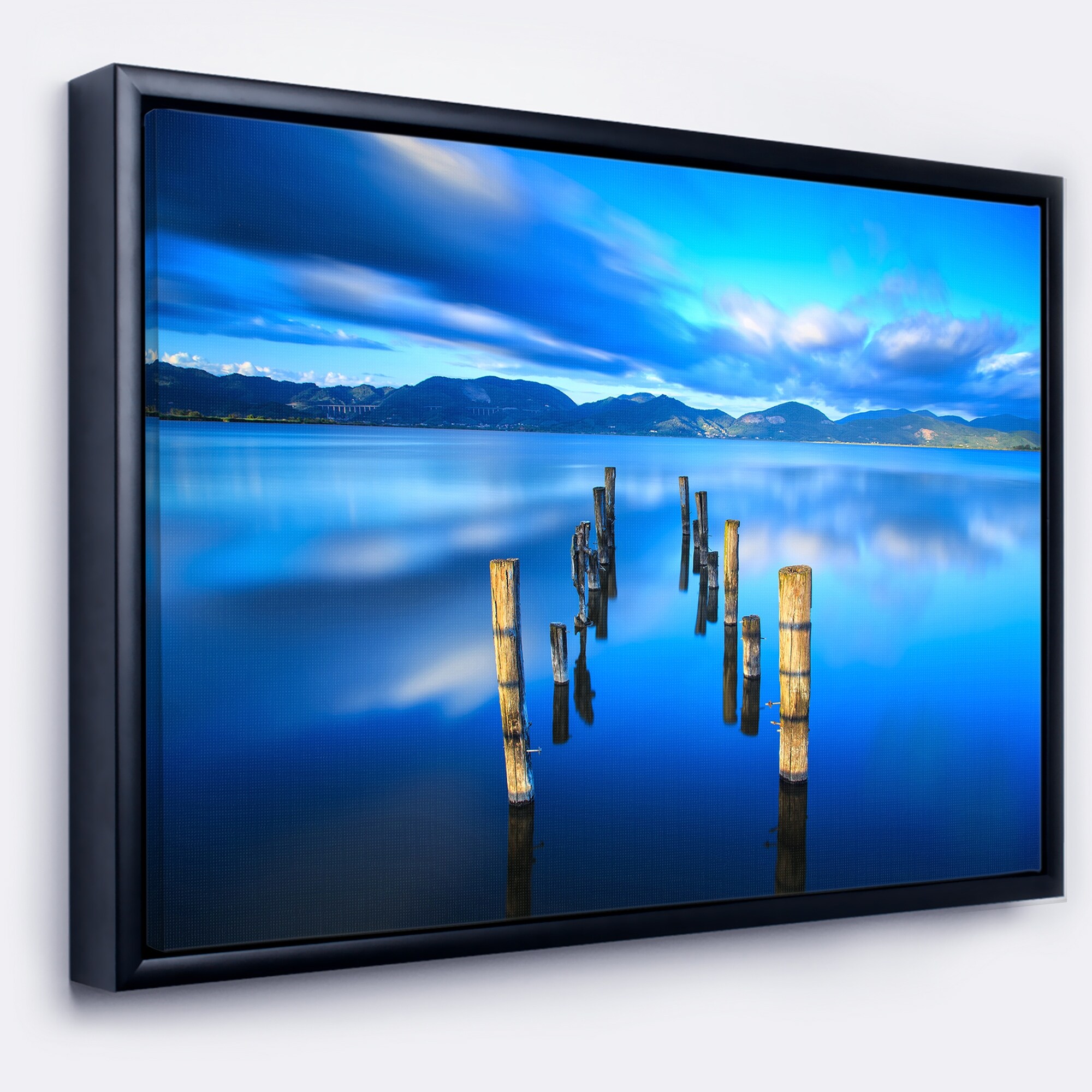 Designart "Wooden Pier Remains in Blue Sea" Seascape Framed Canvas Art Print