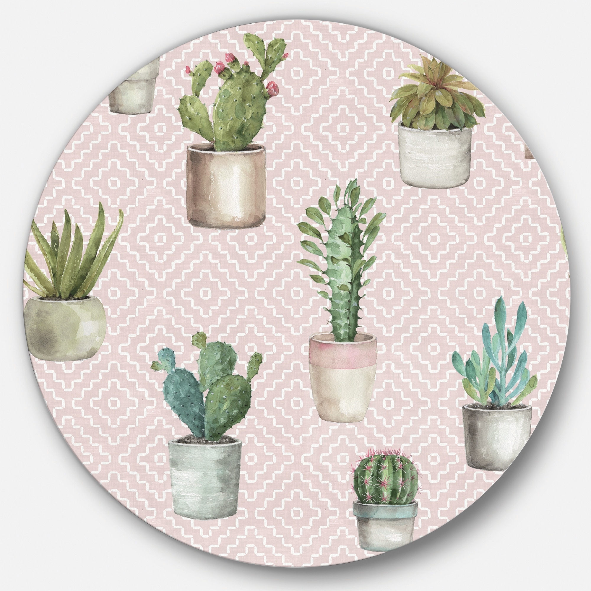 Designart 'Potted Cactus on Pink Geometrical Pattern' Farmhouse Metal Circle Wall Art