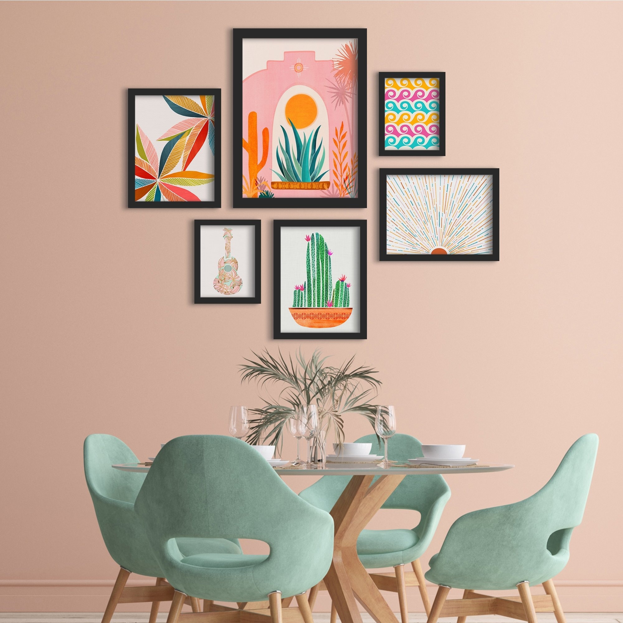 Orange Green Pink Sun & Cactus 6 Piece Framed Gallery Wall Art Set