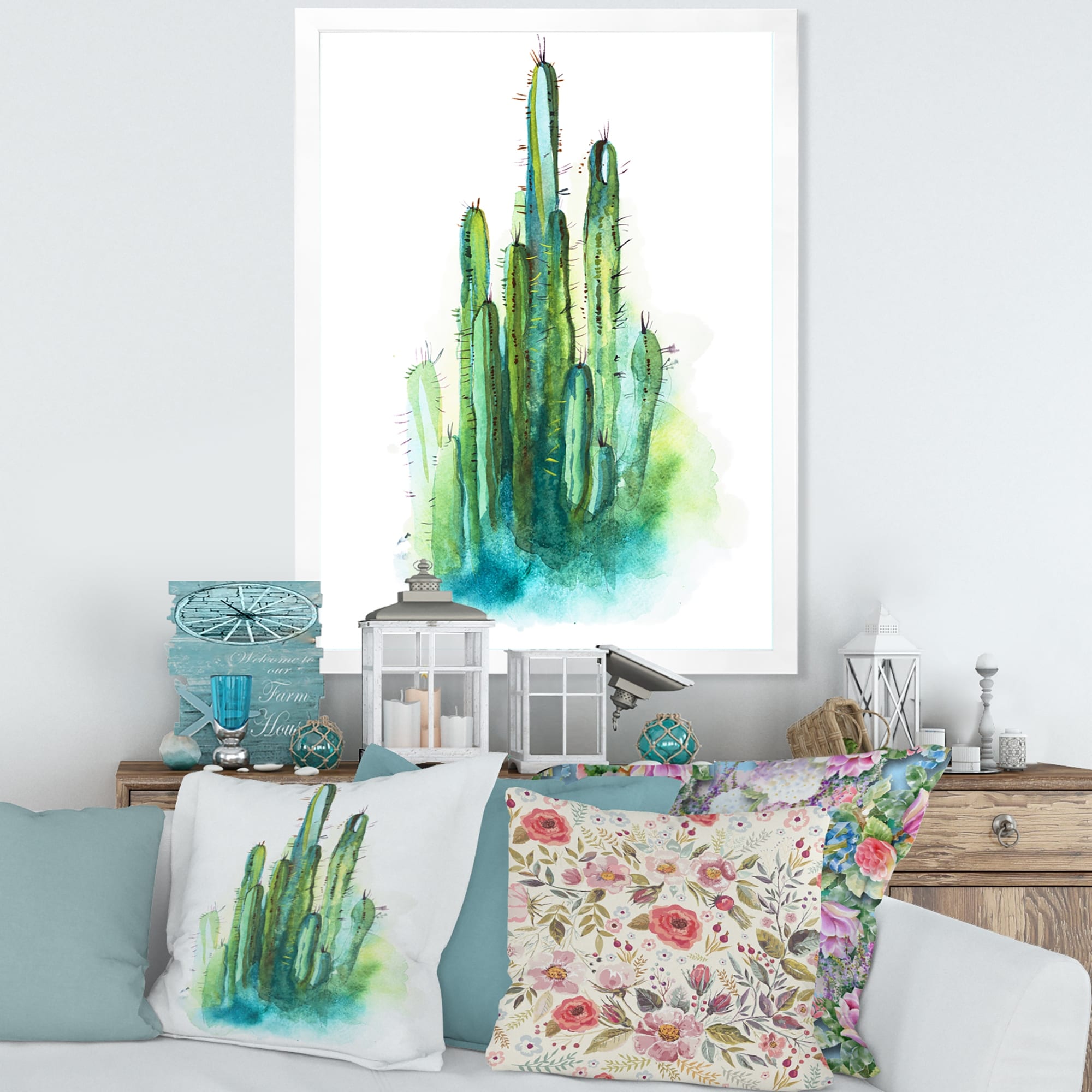 Designart "White Green Cactus Flower Ii" Floral Cactus Framed Wall Art for Living Room