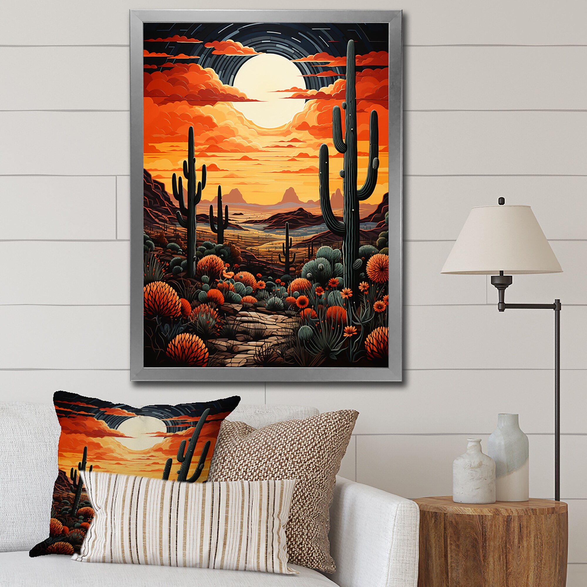 Designart "Orange Yellow Cactus Desert Sunset Saguaro" Cactus Framed Wall Decor
