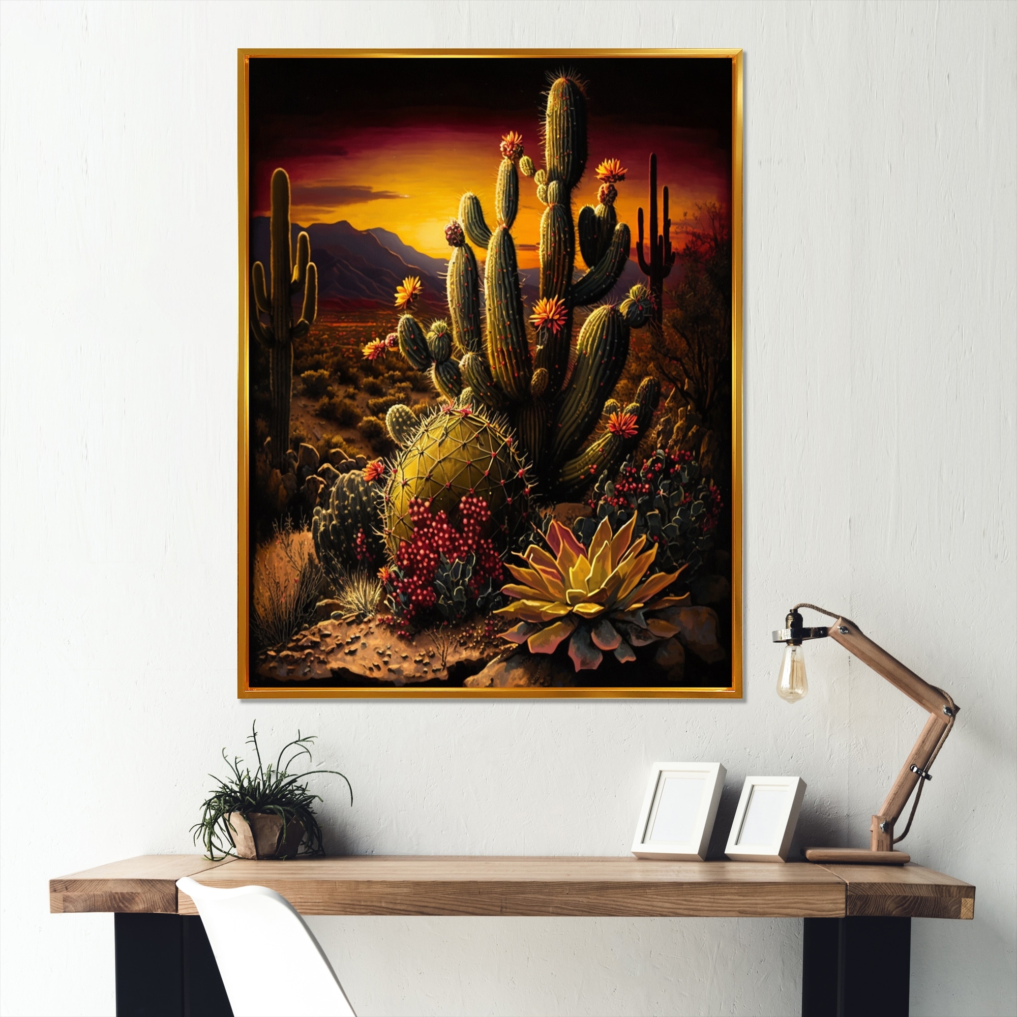 Designart "Cactus In Desert II" Mountains Framed Canvas Art Print