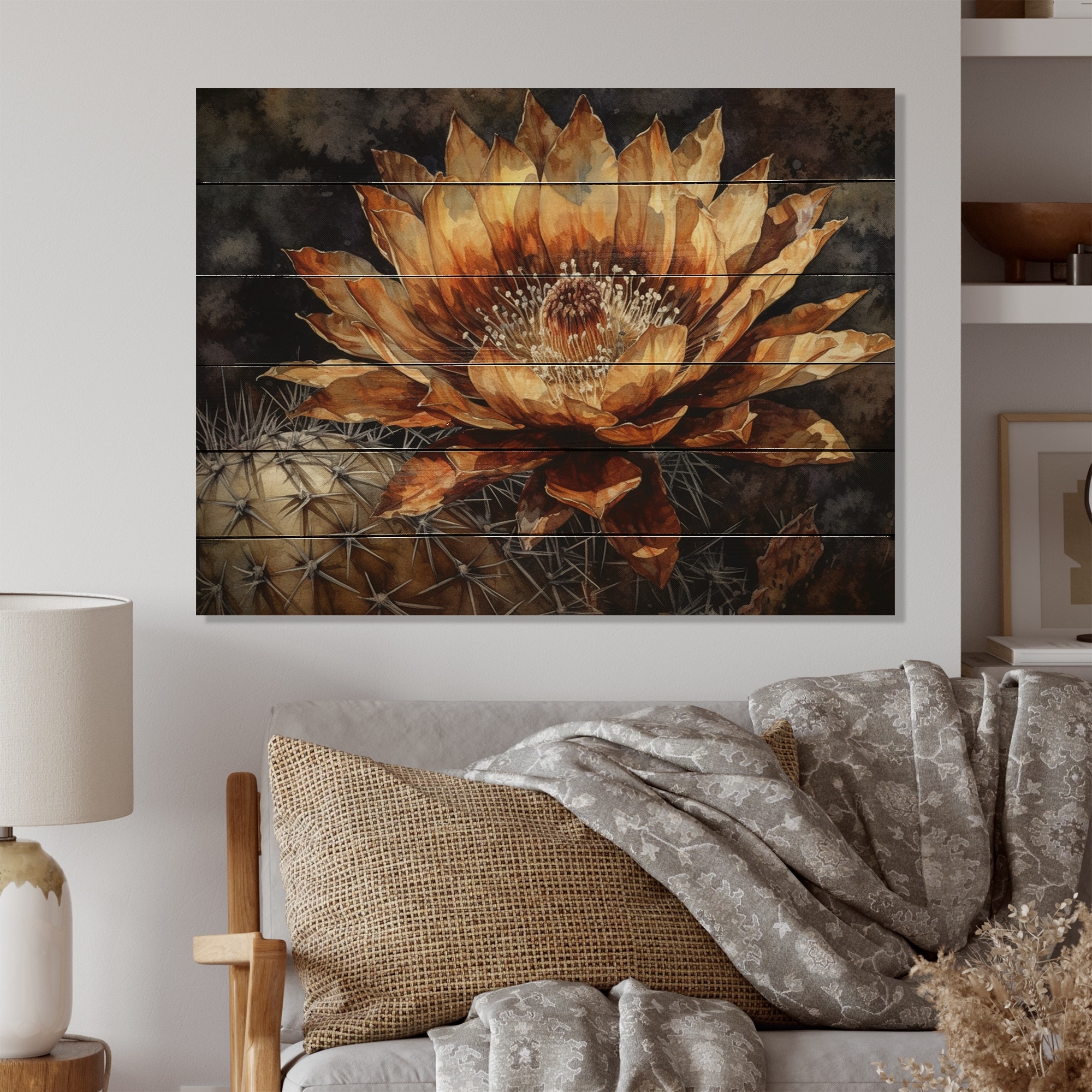 Designart "Brown Cactus Flower" Floral Cactus Print on Natural Pine Wood