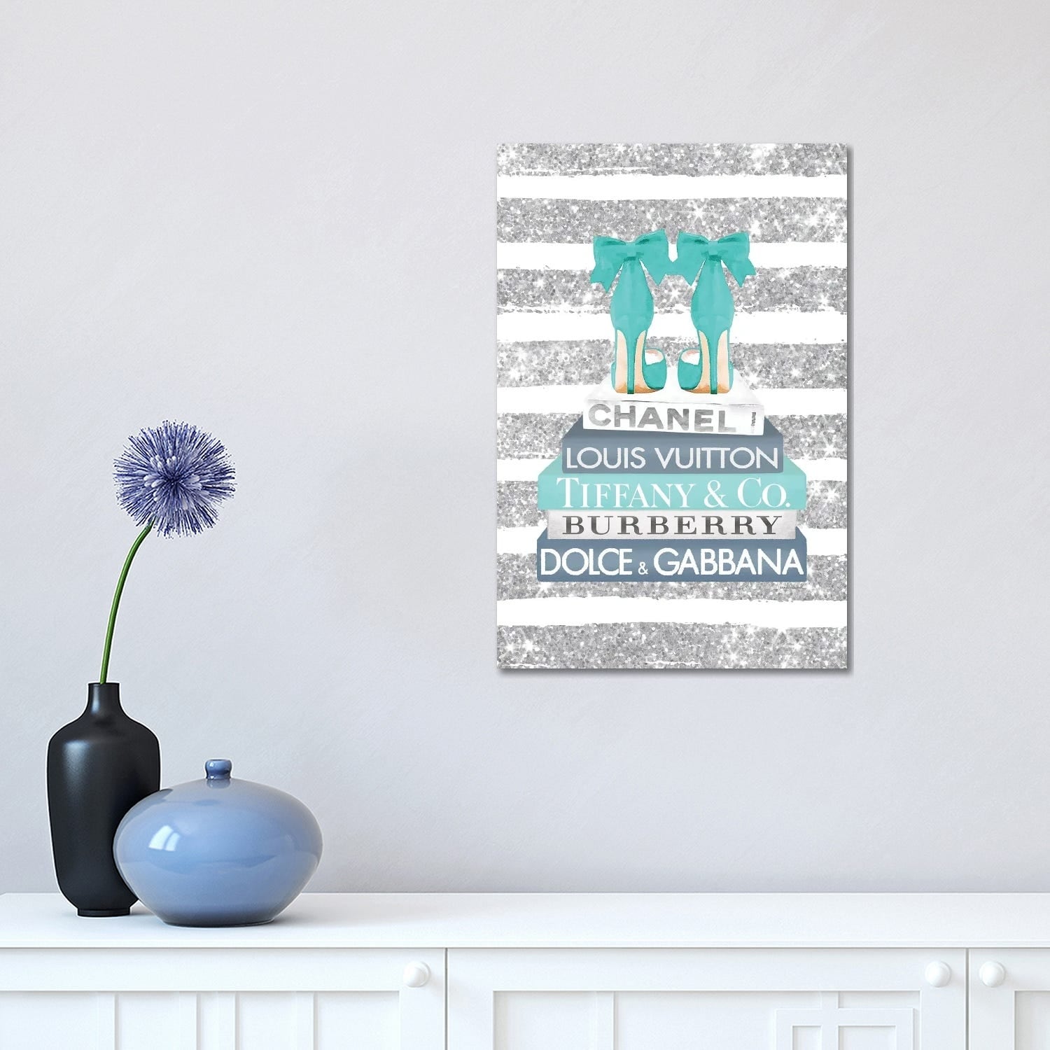 iCanvas "Blue And Teal Fashion Books With Bow Shoes Glitter Stripe" by Amanda Greenwood Canvas Print