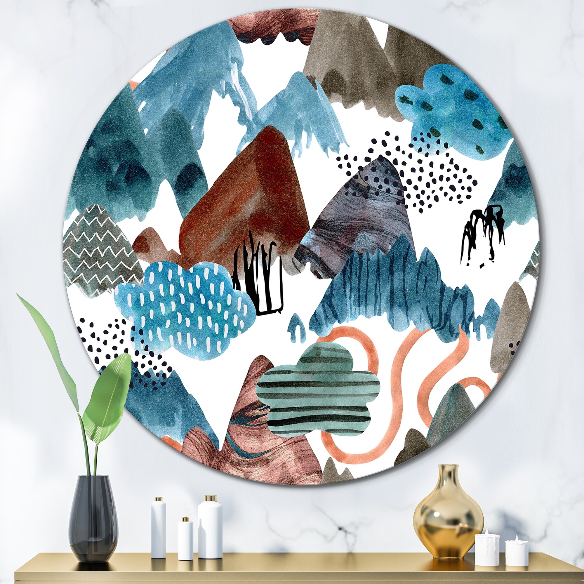 Designart 'Blue And Brown Abstract Mountains' Children's Art Metal Circle Wall Art