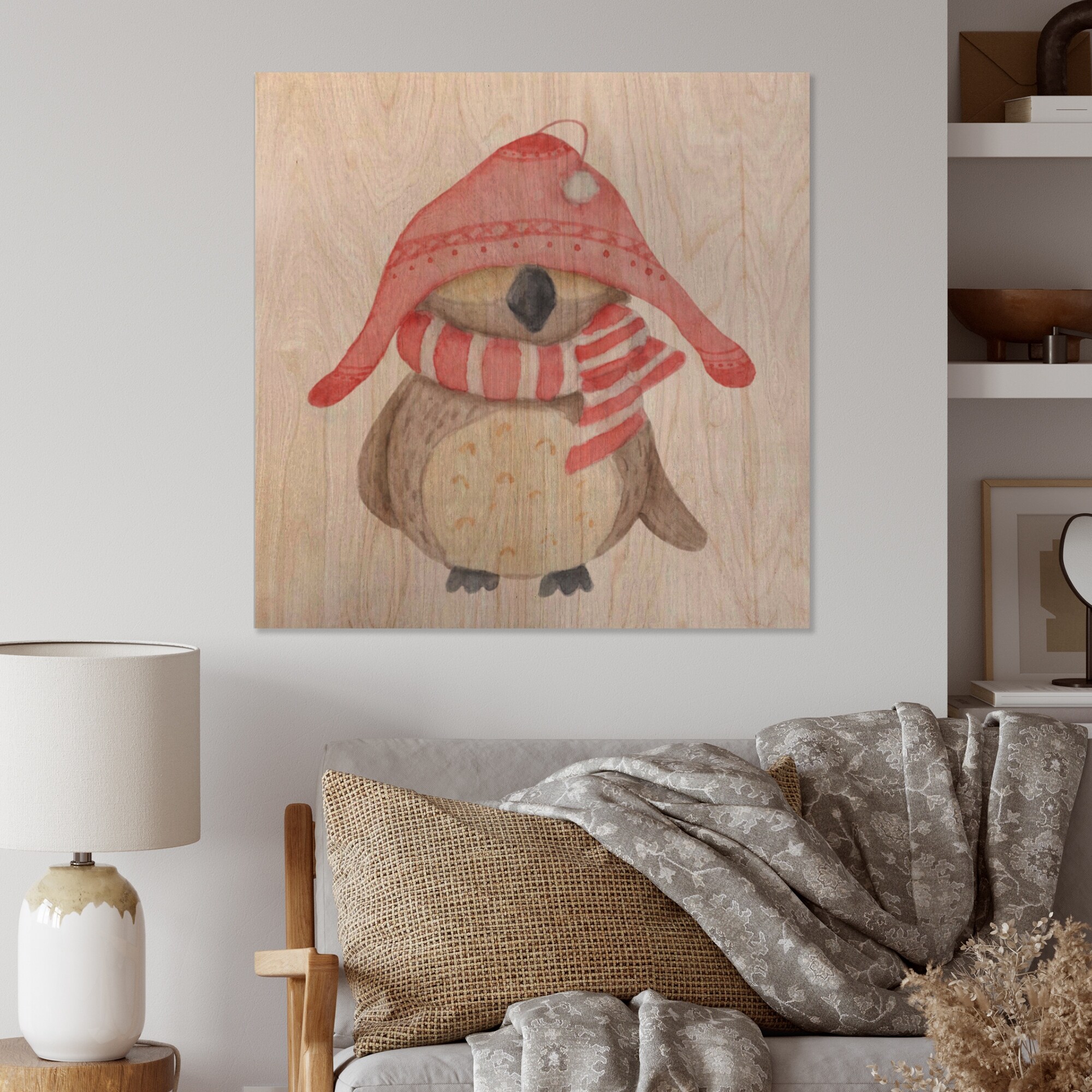 Designart 'Cute Christmas Owl Portrait' Children's Art Wood Wall Art Panels - Natural Pine Wood