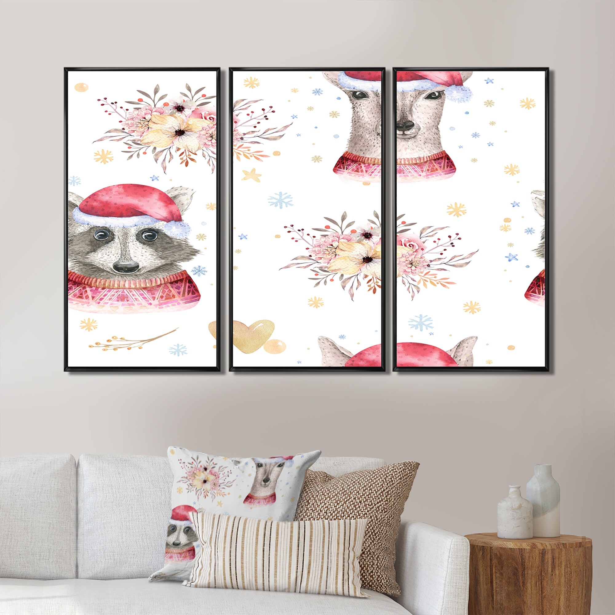 Designart "Cute Forest Cartoon Deer And Cute Raccoon" Children's Art Framed Art Prints Set of 3 - 4 Colors of Frames