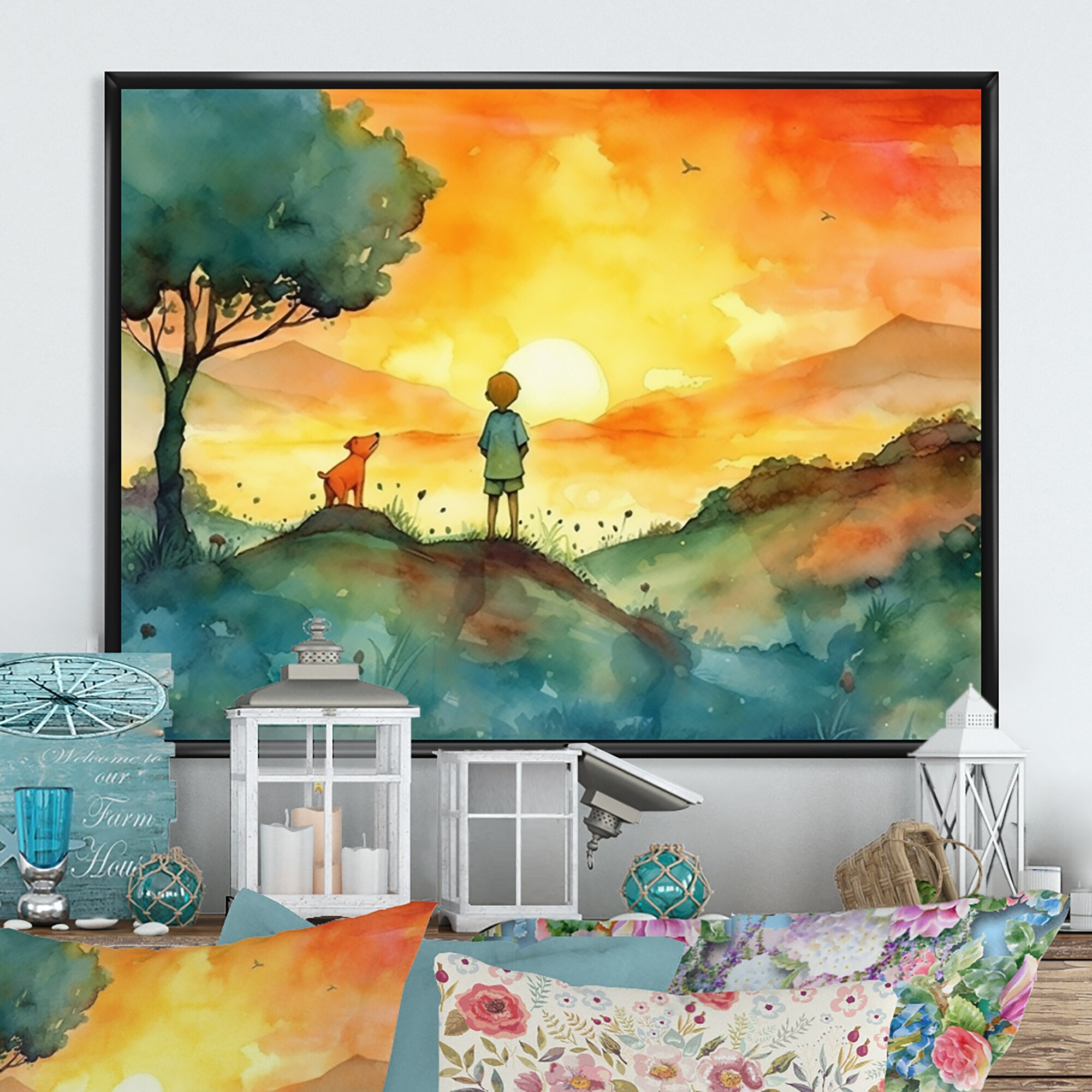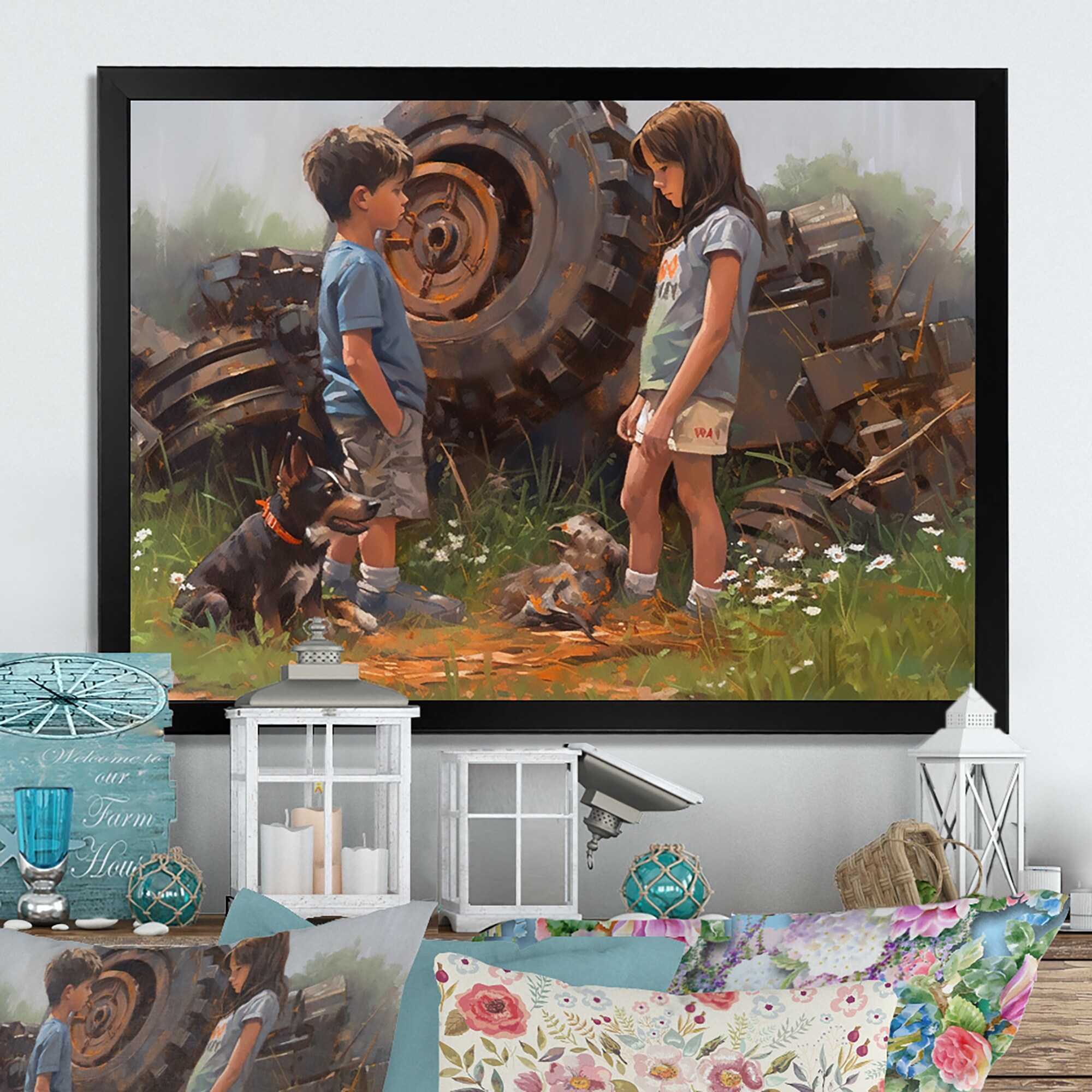 Designart "Children On A Farm Iii" Farm Landscape Framed Wall Art for Living Room