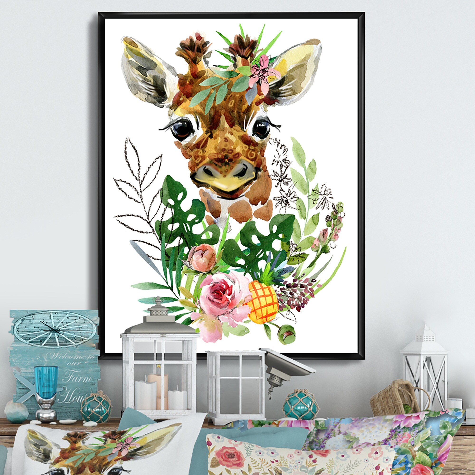 Designart "Cartoon Giraffe With Tropical Flowers III" Children's Art Framed Art Print