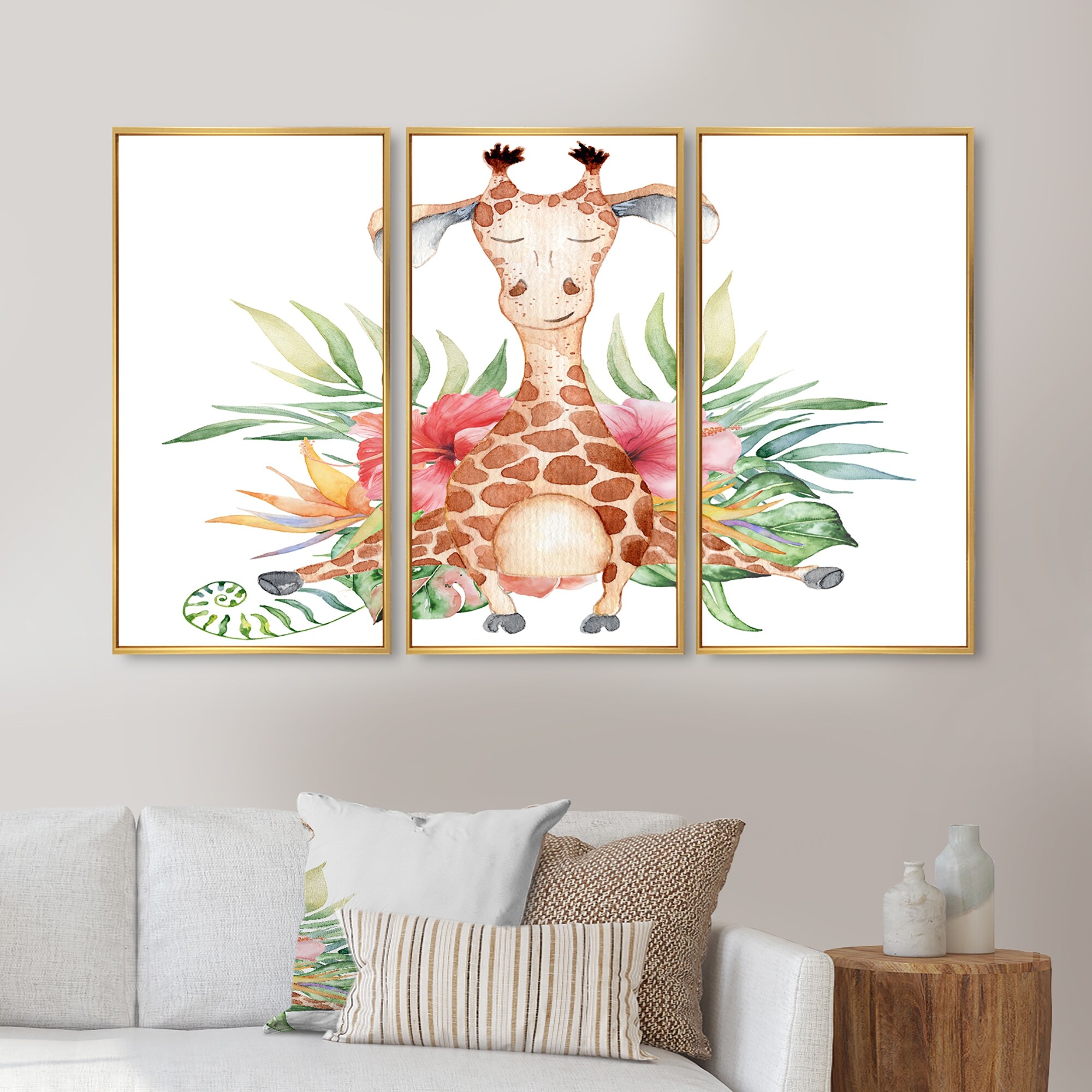 Designart "Cartoon Giraffe With Tropical Flowers III" Children's Art Framed Art Set of 3 - 4 Colors of Frames