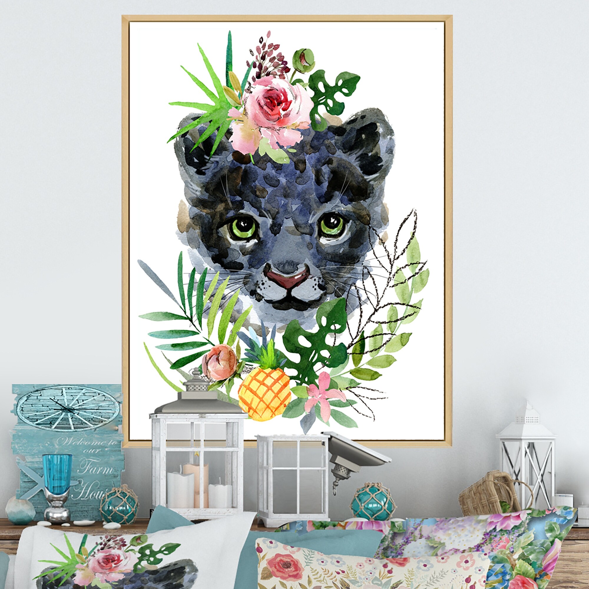 Designart "Cute Tropical Panther Portrait" Traditional Framed Children's Canvas Wall Art