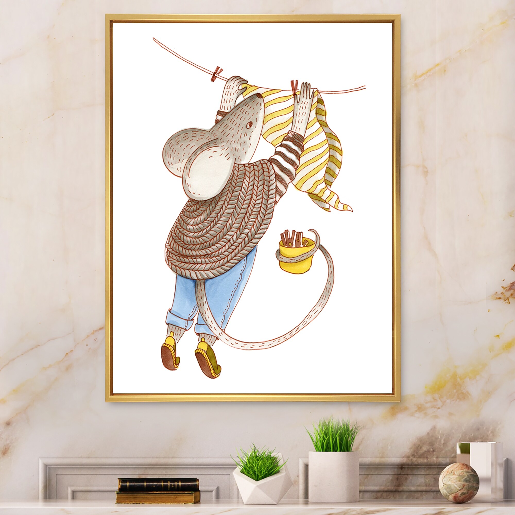Designart "Cartoon White Mouse Doing Laundry" Children's Art Framed Canvas Wall Decor