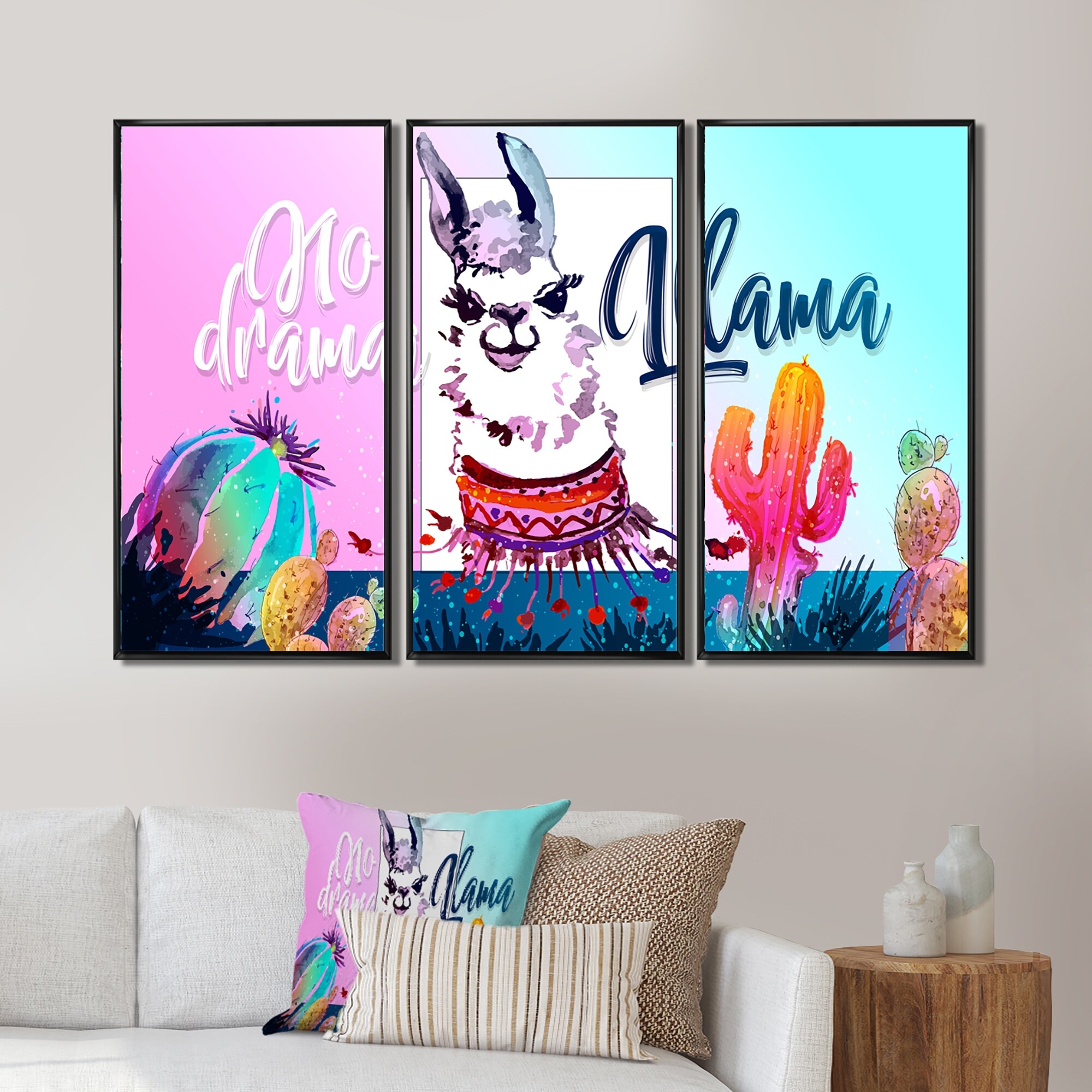 Designart "No Drama Llama" Children's Art Framed Artwork Set of 3 - 4 Colors of Frames