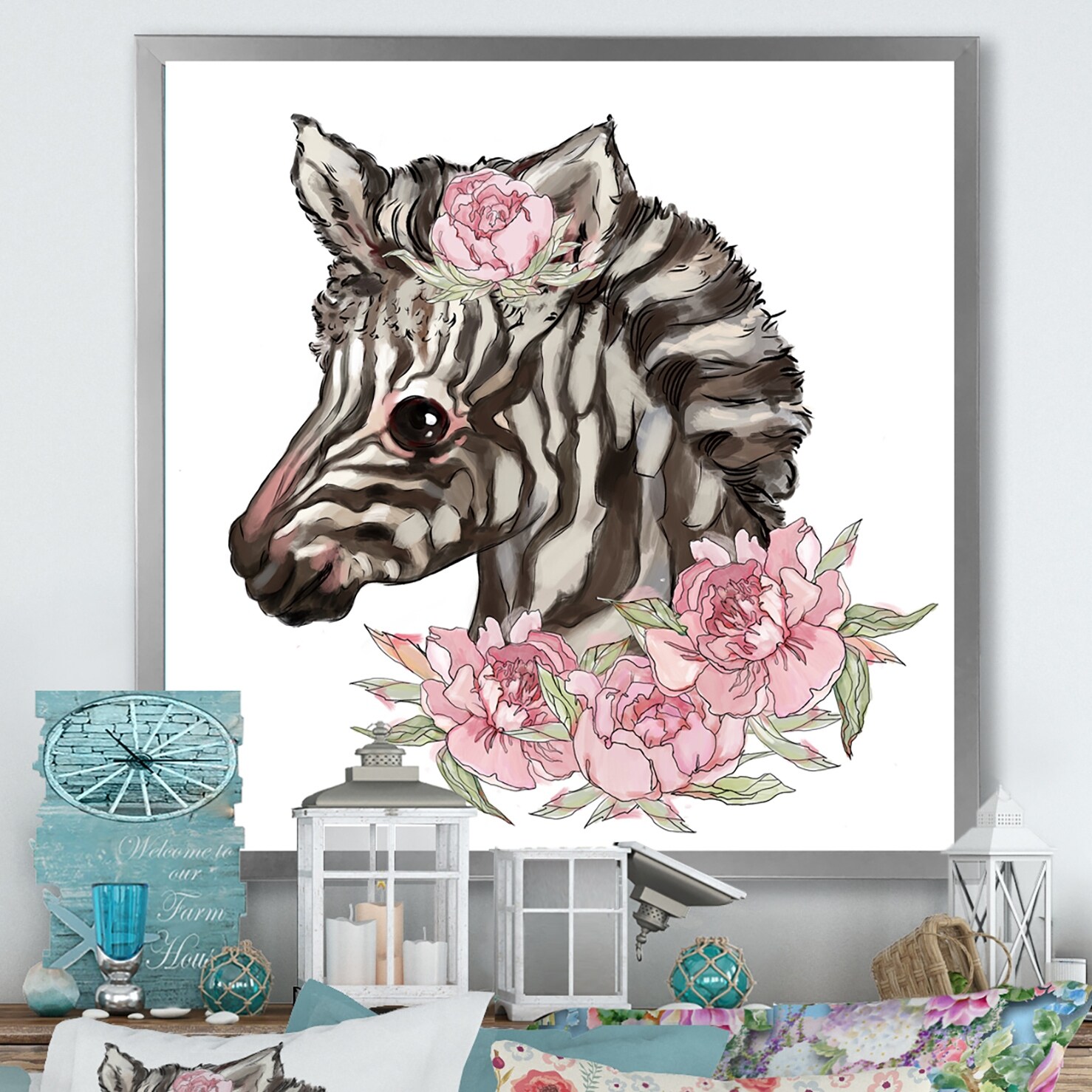 Designart "Cartoon Cute Zebra Portrait" Traditional Framed Children's Wall Art