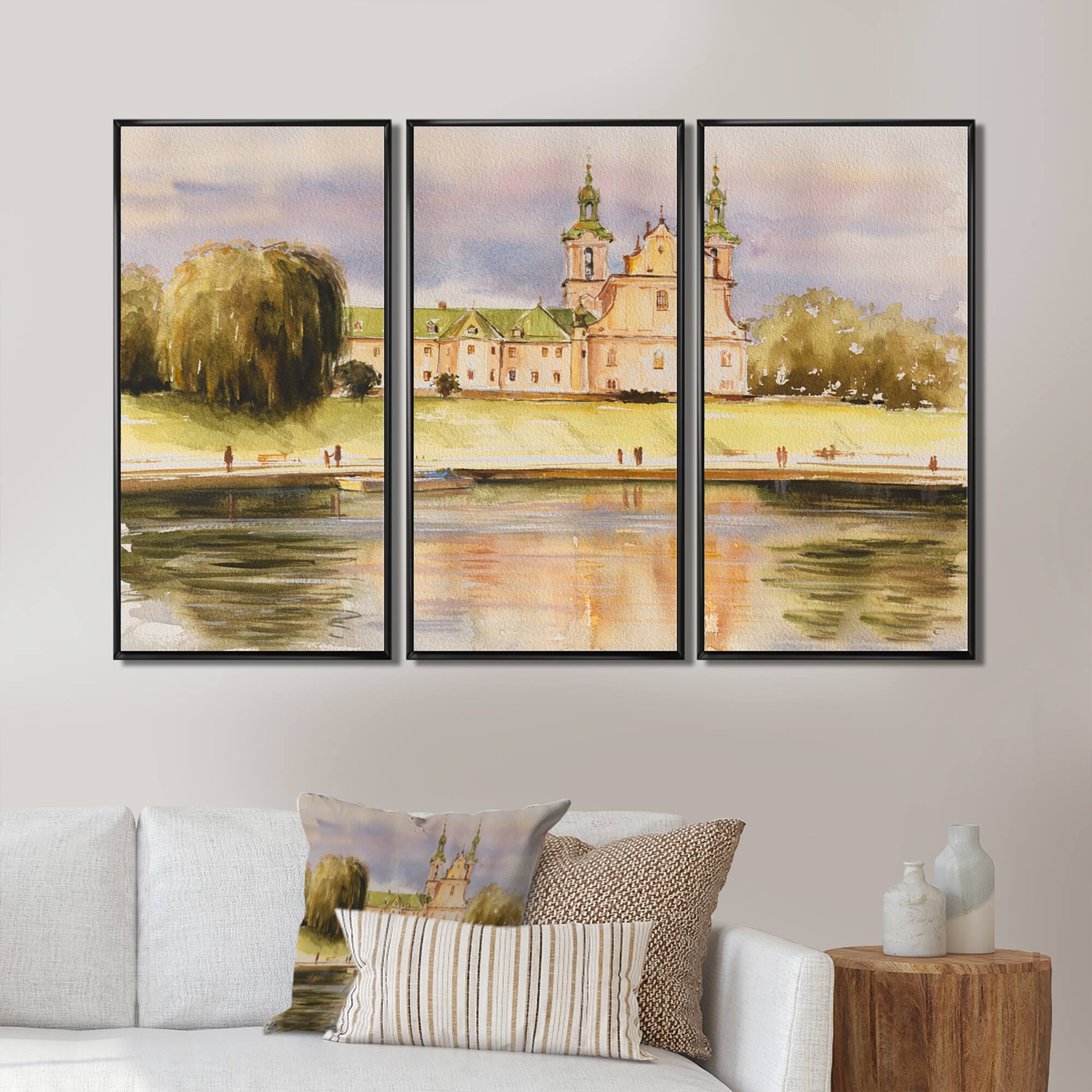 Designart "The Historic Church on the Rock By the River" Lake House Framed Canvas Wall Art Print Set of 3 - 4 Colors of Frames