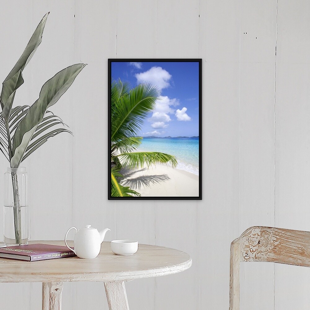 "Coconut palm tree, beach, and ocean in the Virgin Islands, Caribbean" Black Float Frame Canvas Art