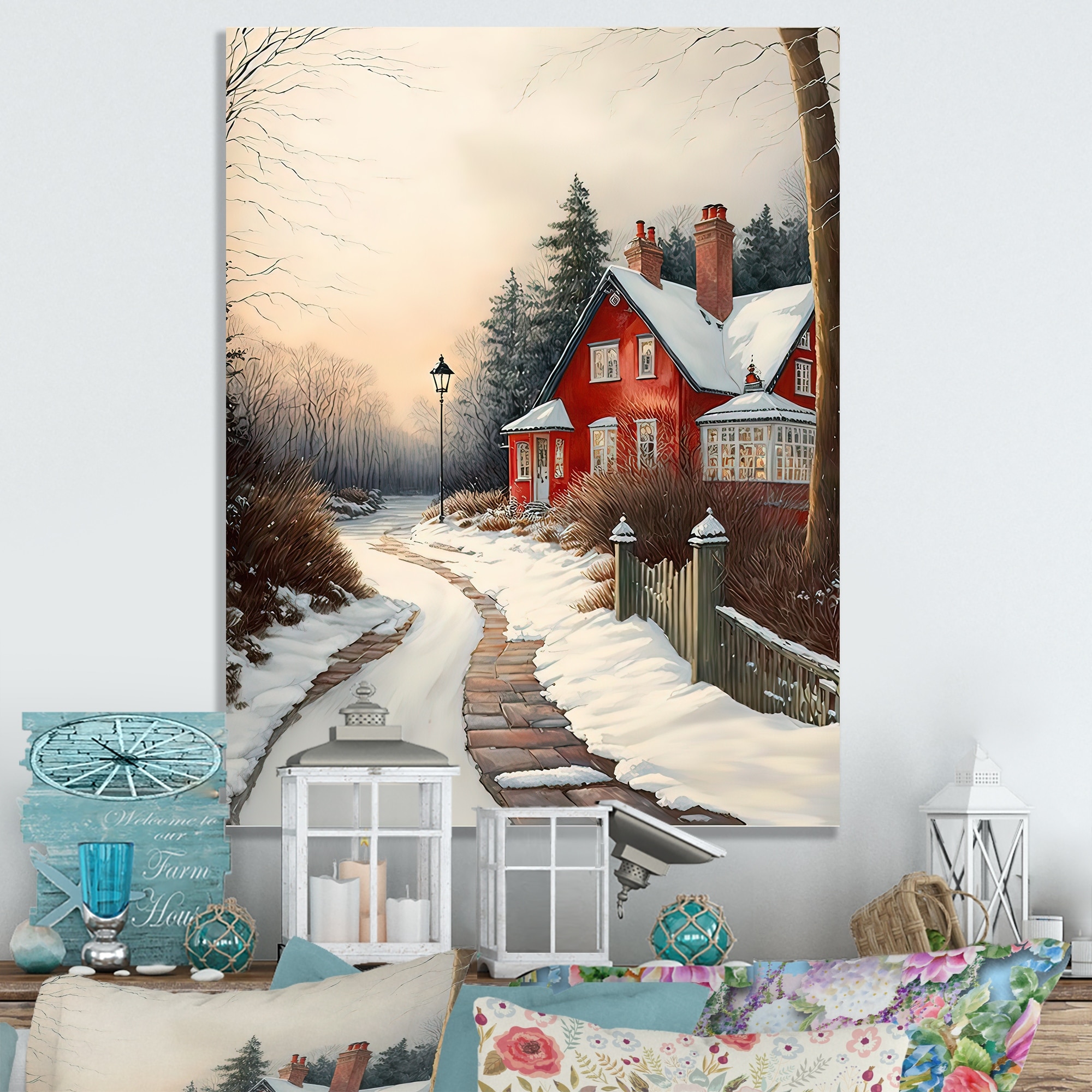 Designart "Cottage Into A Cold Winter Landscape" Cabin & Lodge Framed Canvas artwork