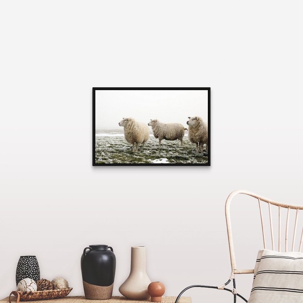 "Three sheep in a meadow, on a cold and foggy morning, all looking in the same" Black Float Frame Canvas Art
