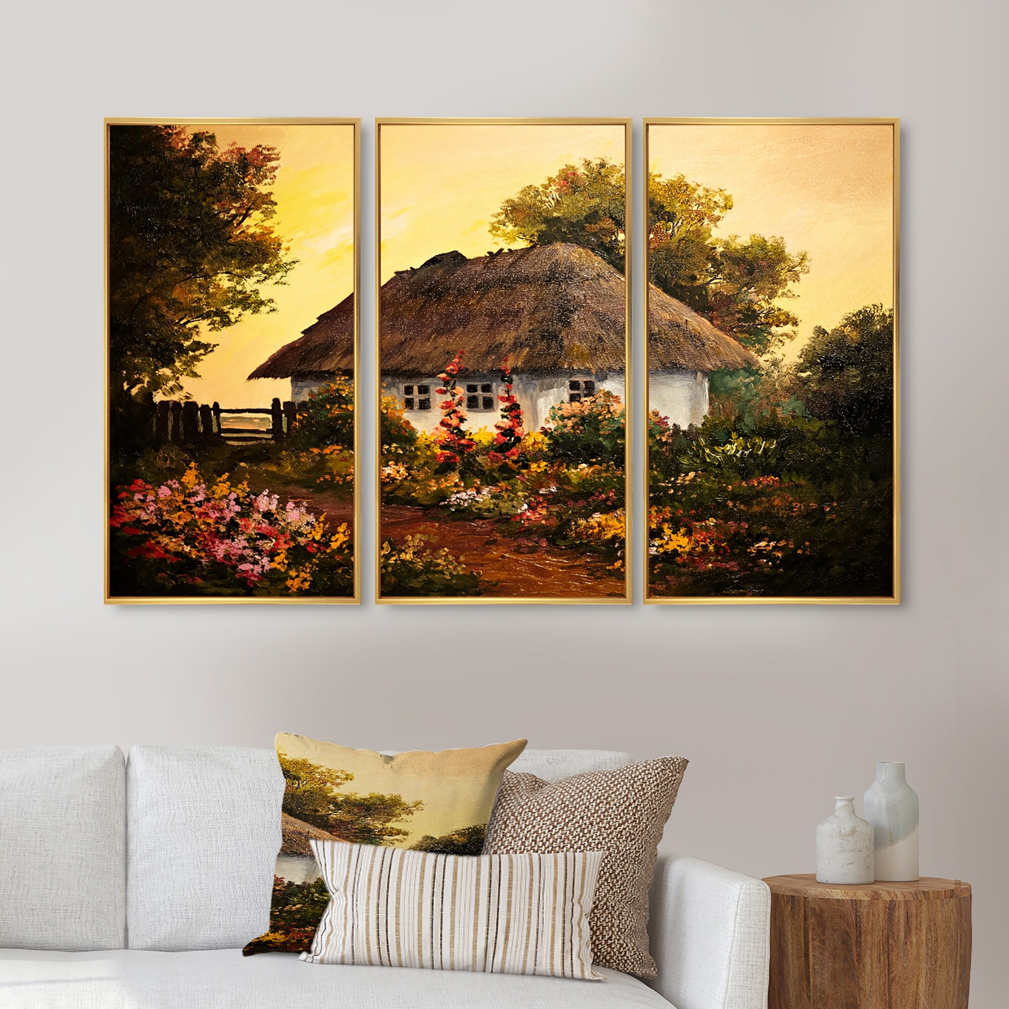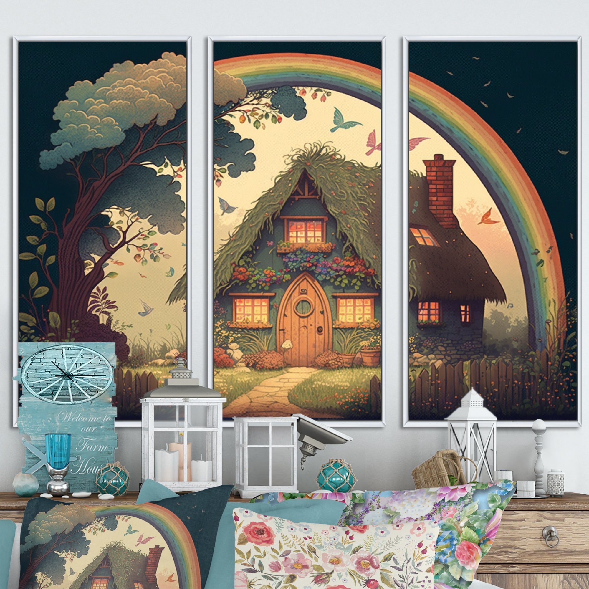 Designart "Cozy Country Cottage Under the Rainbow IV" Lake House Cottage Framed Canvas Wall Art Print - 3 Panels