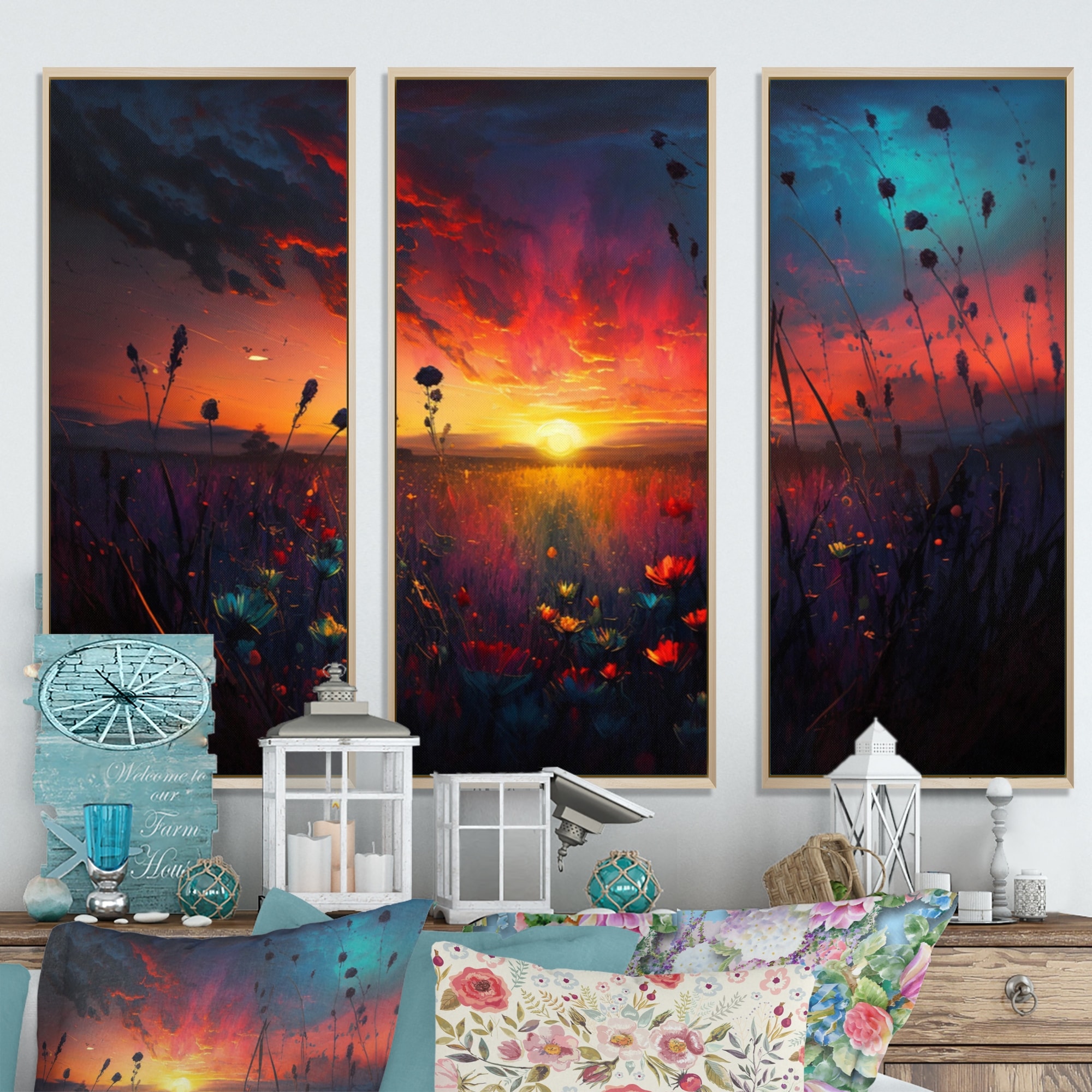 Designart "Flowerful Countryroad At Sunset I" Lake House Cottage Framed Canvas Wall Art Print - 3 Panels