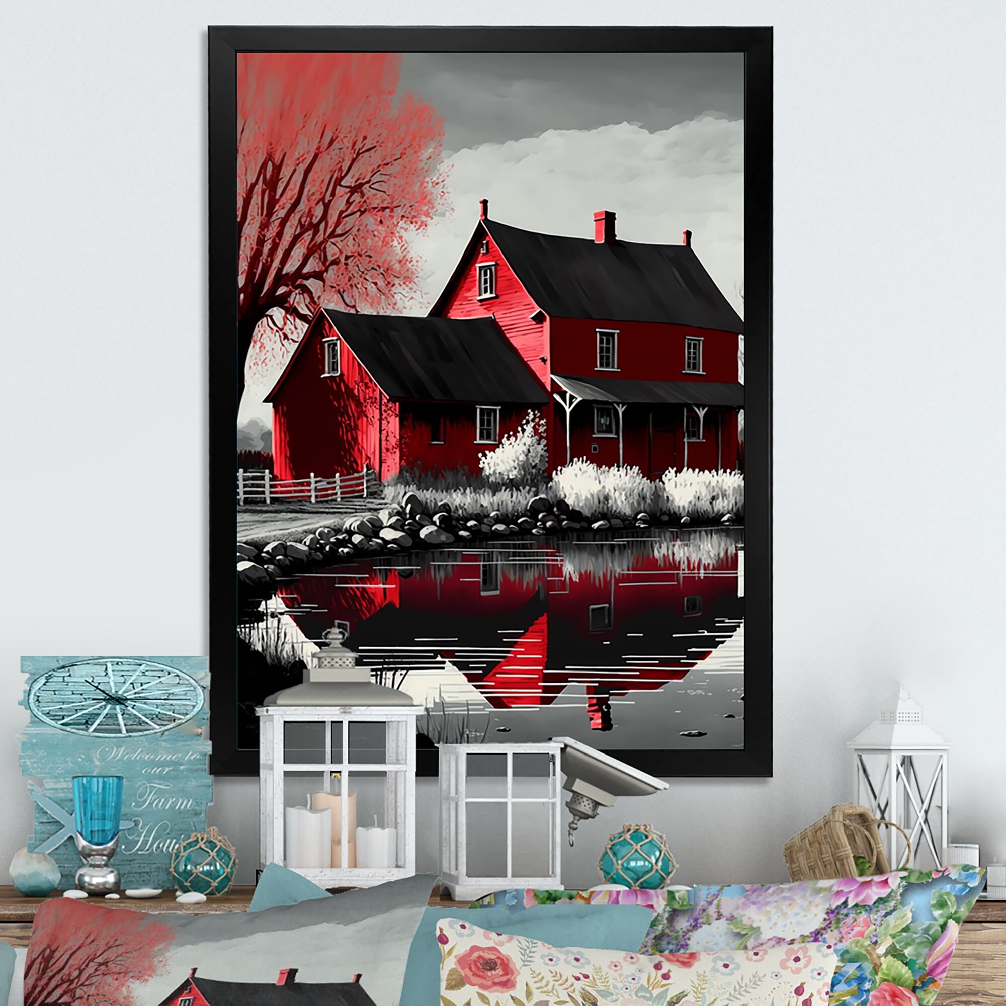 Designart "Red Cottage By the Lakeside" Landscape Cottage Framed Art Print