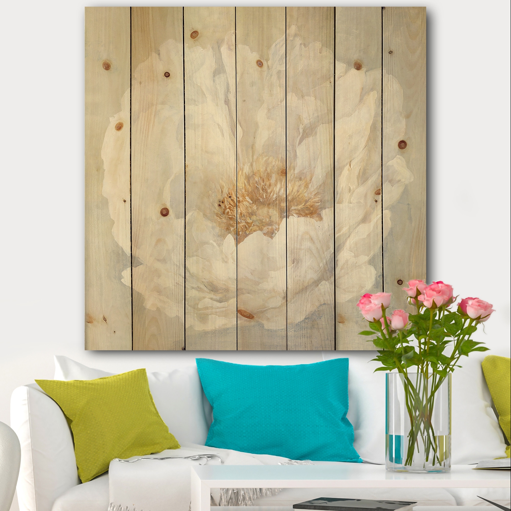 Designart 'White Serene Peony' Cottage Print on Natural Pine Wood - White