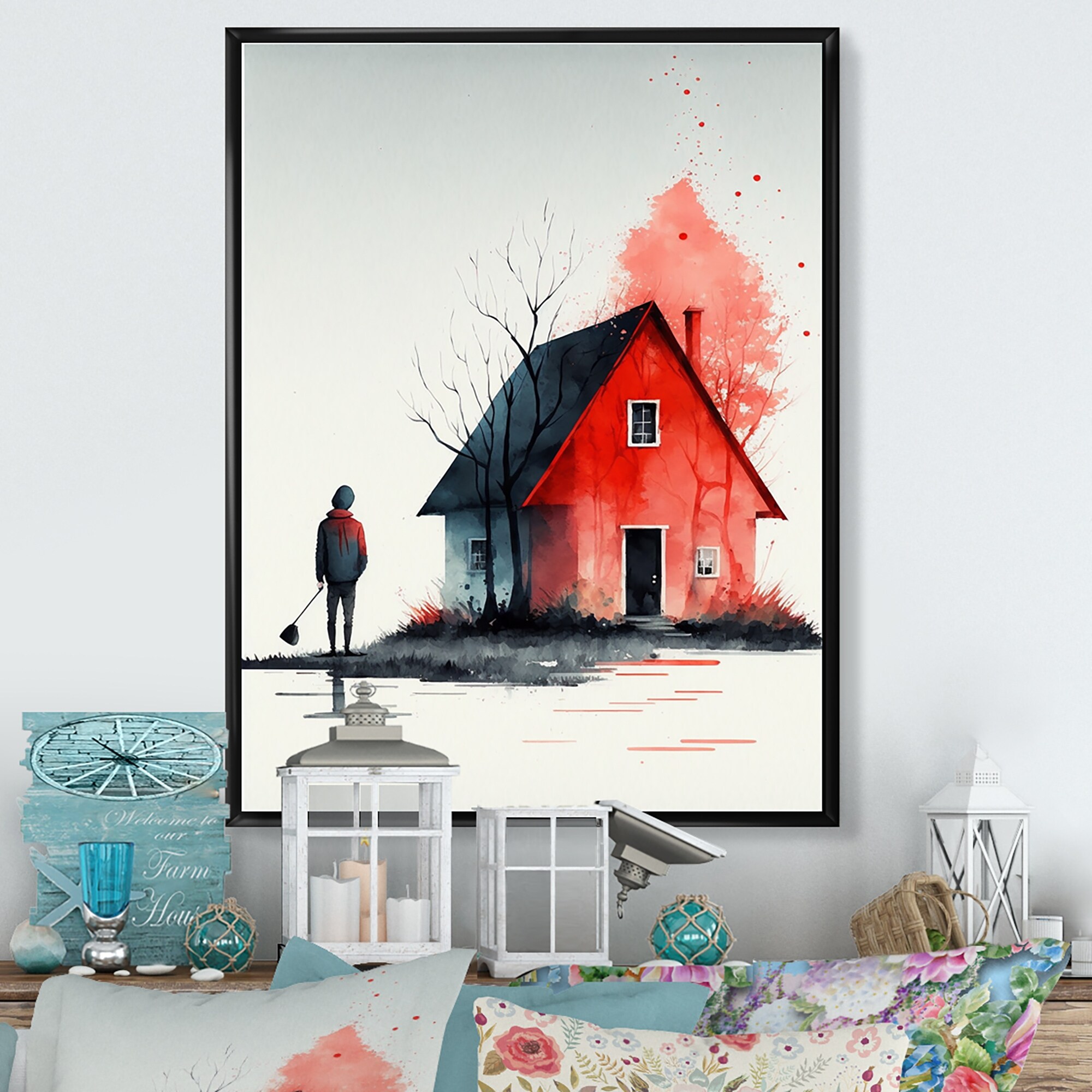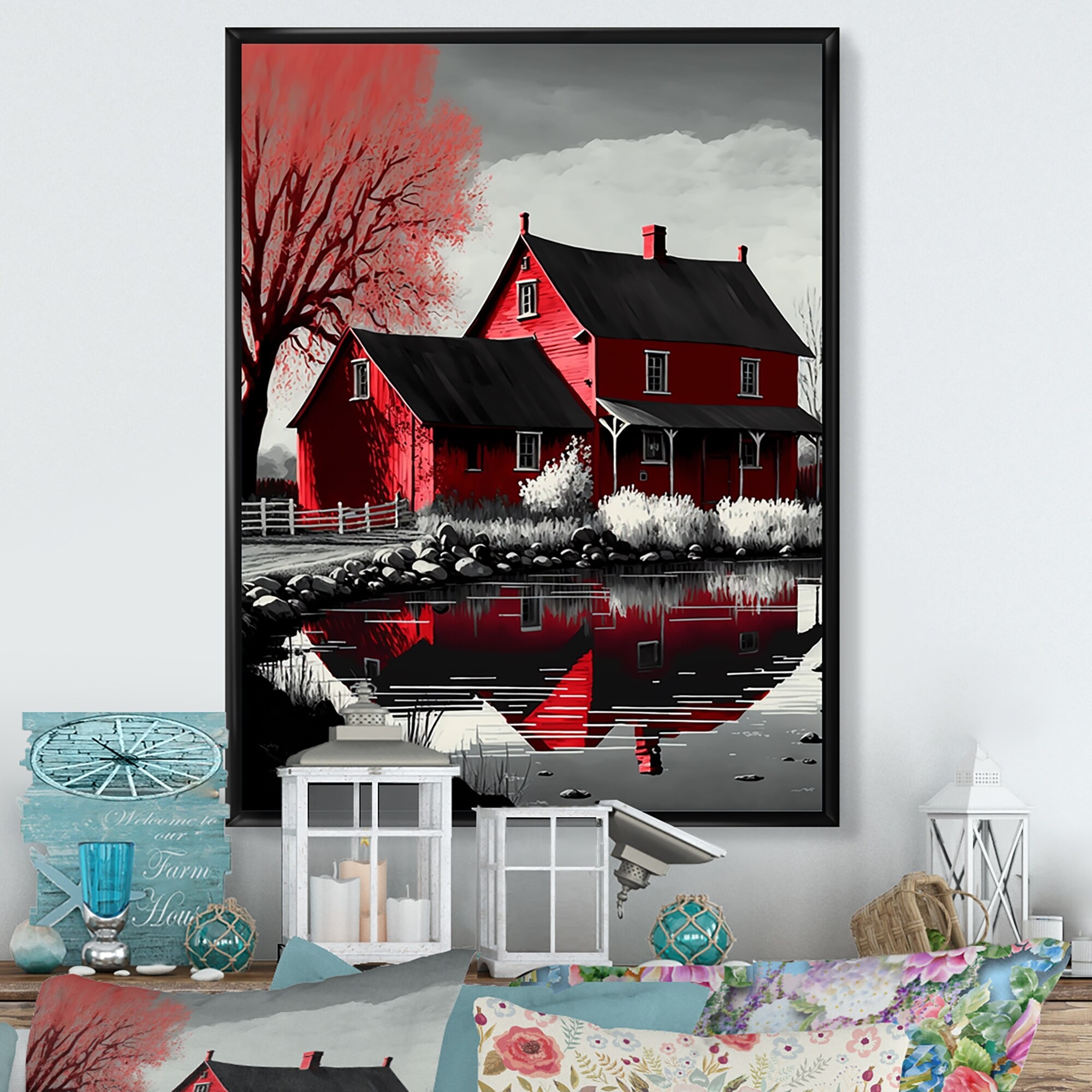 Designart "Red Cottage By the Lakeside" Landscape Cottage Framed Canvas Wall Art Print