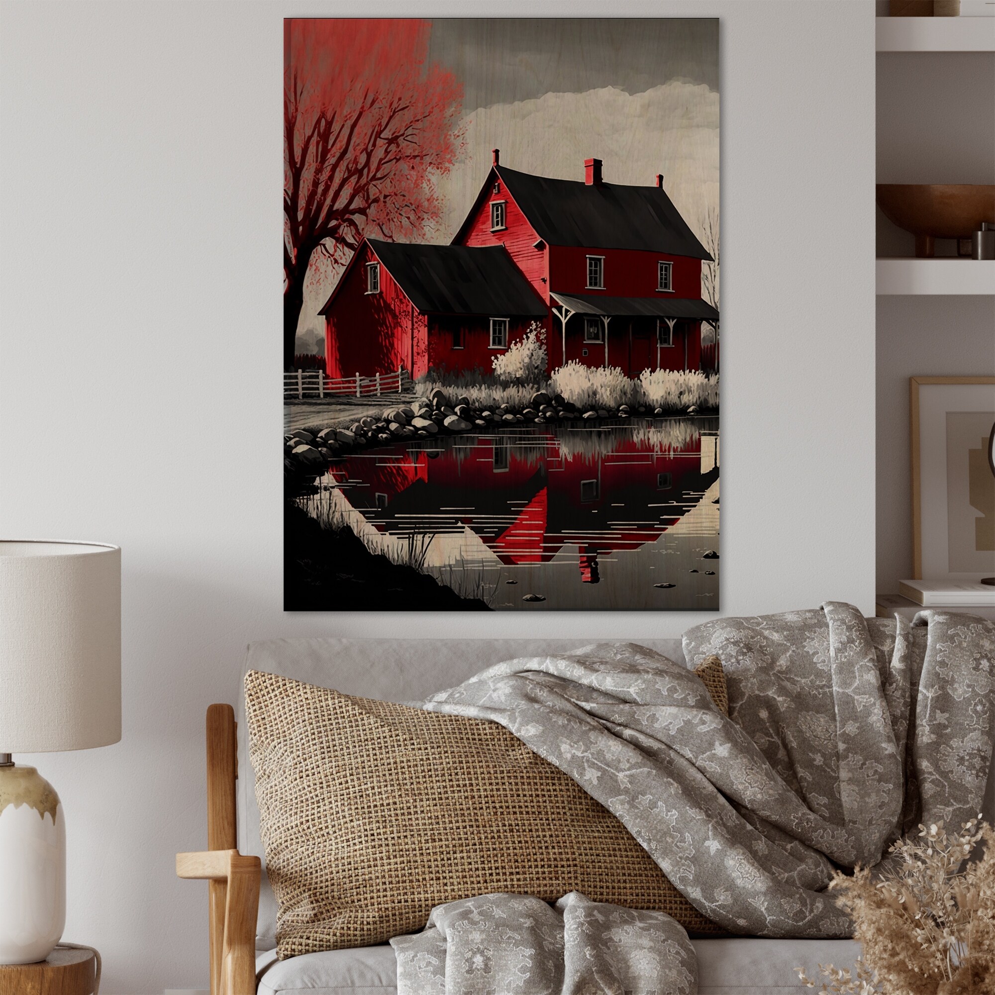 Designart 'Red Cottage By the Lakeside' Landscape Cottage Wood Wall Art - Natural Pine Wood