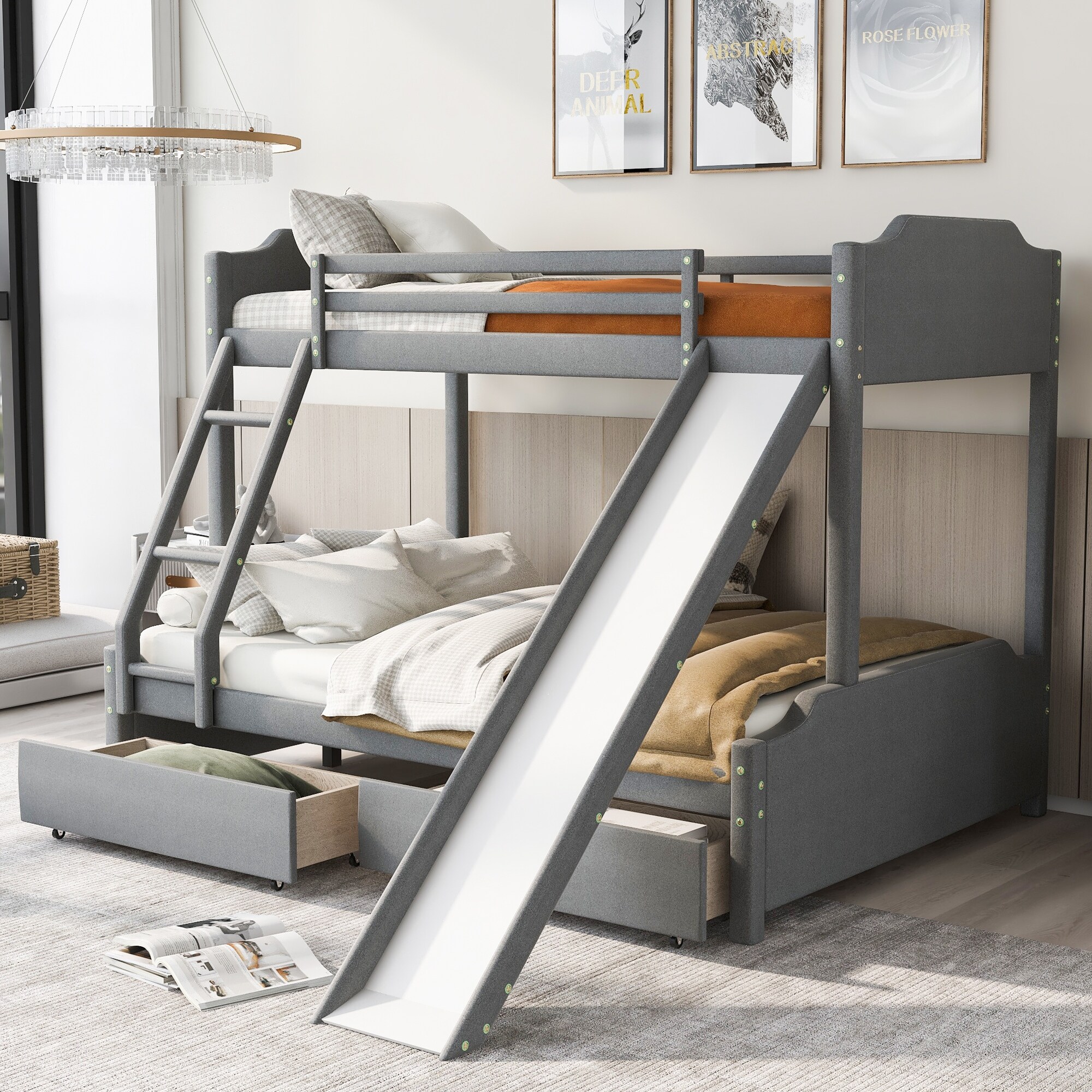 Twin Over Full Upholstery Bunk Bed with 2 Drawers, Convertible Slide & Ladder, Solid Wood Bedframe with Headboard & Footboard
